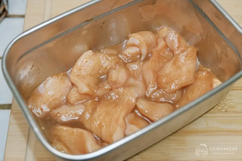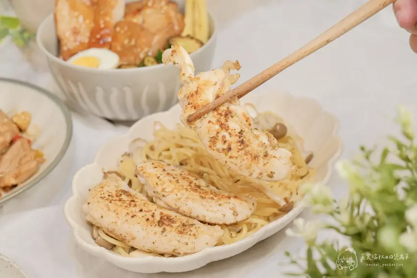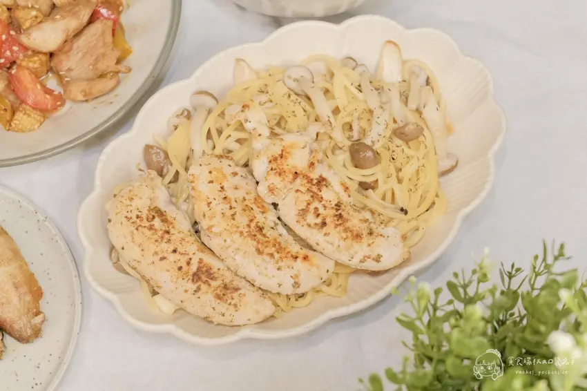第二道是適合晚餐或帶便當的「香料雞柳白醬義大利麵」。選用油脂含量低、纖維細緻的「里肌肉」,簡單撒上義式香料、胡椒與鹽進行醃製,再下鍋煎至兩面呈現微焦的金黃色澤。最後將其鋪在煮好的松露白醬菇菇義大利麵上,即大功告成。里肌肉質柔軟不乾柴,香料的清香與濃郁的松露白醬形成完美平衡,每一口都能吃到雞肉的鮮甜與醬汁的奶香,是大人小孩都無法抗拒的經典組合。