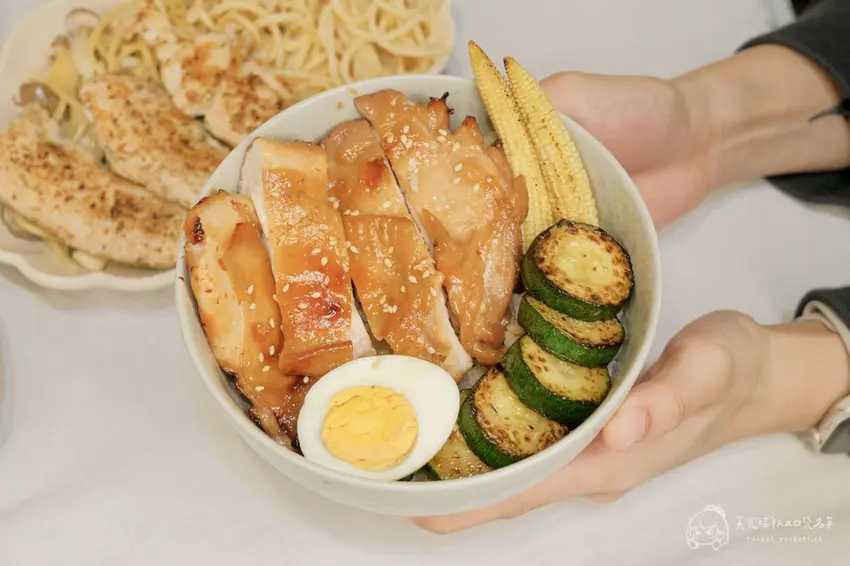 想吃大餐又不開火?這道「蜜汁雞腿蓋飯」絕對是懶人救星。使用「去骨清腿」先以市售的親子丼醬汁醃製入味,接著放入氣炸鍋烹調至外皮金黃酥脆。將炸好的雞腿鋪在熱騰騰的白飯上,再搭配一點蔬菜點綴,賣相完全不輸外面餐廳。經過氣炸後的雞腿將肉汁緊緊鎖在裡面,一口咬下能感受到外皮的酥脆與內裡的多汁軟嫩,鹹甜的蜜汁風味超級下飯,絕對是名副其實的白飯殺手。