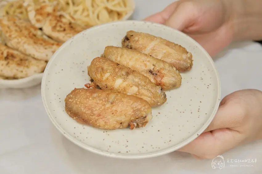 最後一道是聚會必備的「蒜香起司吮指雞翅」。選用膠質豐富的「翅中」部位,先送入氣炸鍋稍微加熱,中途取出塗抹上由蒜末、奶油與起司粉調製而成的特製醬料,再繼續氣炸至熟透。出爐時蒜香與起司香氣撲鼻而來,雞皮烤得酥脆油亮,肉質鮮嫩多汁。益活雞的油脂香而不膩,搭配濃郁的蒜香起司醬,讓人忍不住一支接一支停不下來,是追劇或週末小酌的最佳良伴。