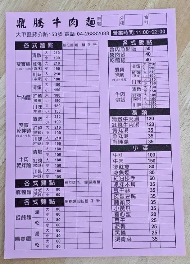最後就用這一桌滿滿的菜色當作收尾,對在地人來說,鼎騰牛肉麵就是那種「想吃牛肉麵時會自然想到的店」。不追求花俏,卻把湯頭、麵條和牛腱肉的品質都顧好,每次來都吃得安心又滿足。不管是自己來簡單吃一碗,還是帶家人朋友一起點滿一桌,份量實在、選擇又多,難怪成為不少人心中的口袋名單。如果你剛好來到大甲,想找一間不踩雷、吃得飽又有水準的牛肉麵店,鼎騰牛肉麵真的很可以。