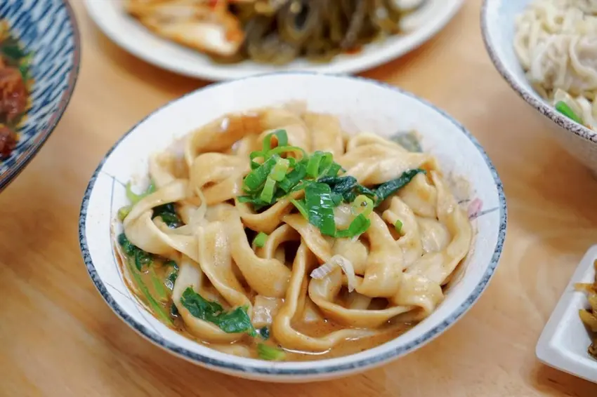 餛飩麵(乾、大碗)小涼選了陽春麵來搭配。不吃牛肉的朋友,除了常見的麻醬麵選項外,這一碗真的很值得點來試試。店家手工包的餛飩顆顆紮實,皮薄餡香,拌開乾麵時才發現,裡頭竟然還藏著切絲的豆干,多了份豆香與口感層次,陽春麵條滑順又帶點彈性,整體吃起來是熟悉又讓人懷念的古早味。