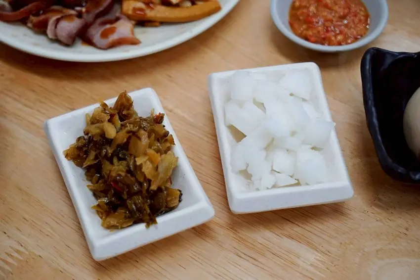 內用的餐具與各式佐料皆採自取方式,小涼私心一定要推薦他們家的自製辣椒,香氣真的很足,不論是拌進麵條裡,還是搭配小菜一起吃都很加分。店家自炒的酸菜也很厲害,加進紅燒牛肉麵裡,整個風味層次直接拉高,越吃越涮嘴。另外姊妹們最愛的,絕對是圖中的爽脆醃蘿蔔,口感清脆、酸度溫和,不會有一般醃蘿蔔那種過於刺激的酸味,吃起來相當順口,不管配麵還是配飯都很清爽,也難怪深得大家的喜愛。