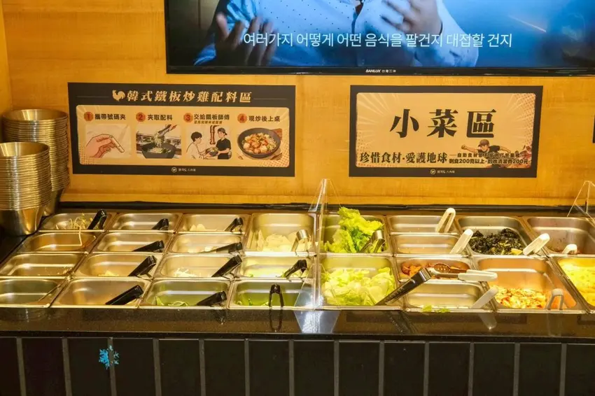 ▼韓式鐵板炒雞(辣椒、玉米、蒜末、蔥末、魚板、豆皮、豆腐、九層塔、金針菇、杏鮑菇、年糕、空心菜、大黃瓜、高麗菜),會由服務人員現場拌炒,可以選擇要辣還是不辣,夠味討喜讓人停不下來!