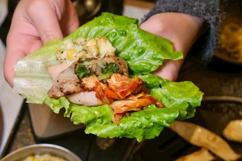 ▼雞松阪吃起來肉感Q彈,包生菜和泡菜一起吃更讚, 雞橫膈膜位於雞隻胸腔和腹腔之間,彈嫩有嚼勁帶有適量油脂,是會越吃越香的類型,兩款都可選擇辣或不辣!