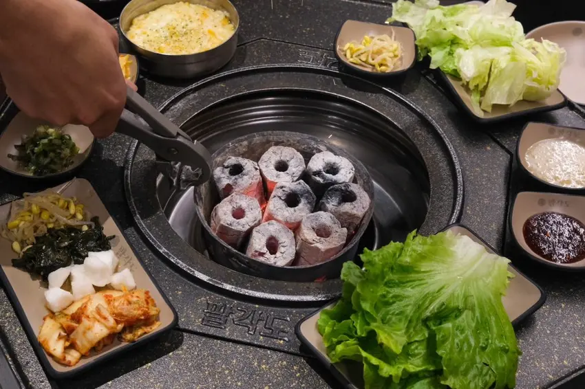 ▼【八角道 韓國炭火烤肉】採用炭火燒肉,火候十足烤起來特別香,店內不忙的時候,店員也會幫你暖心烤肉肉。