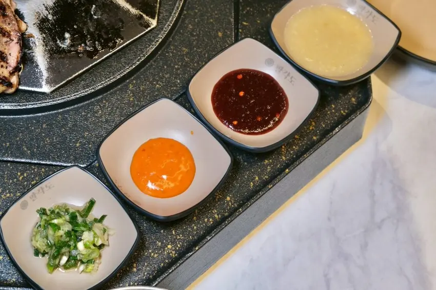 ▼搭配烤肉的韓式秘製醬料有:「芥末、蛋黃醬、辣醬、大蒜醬」,每一款都各有風味。