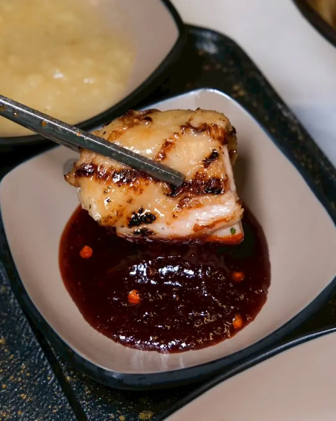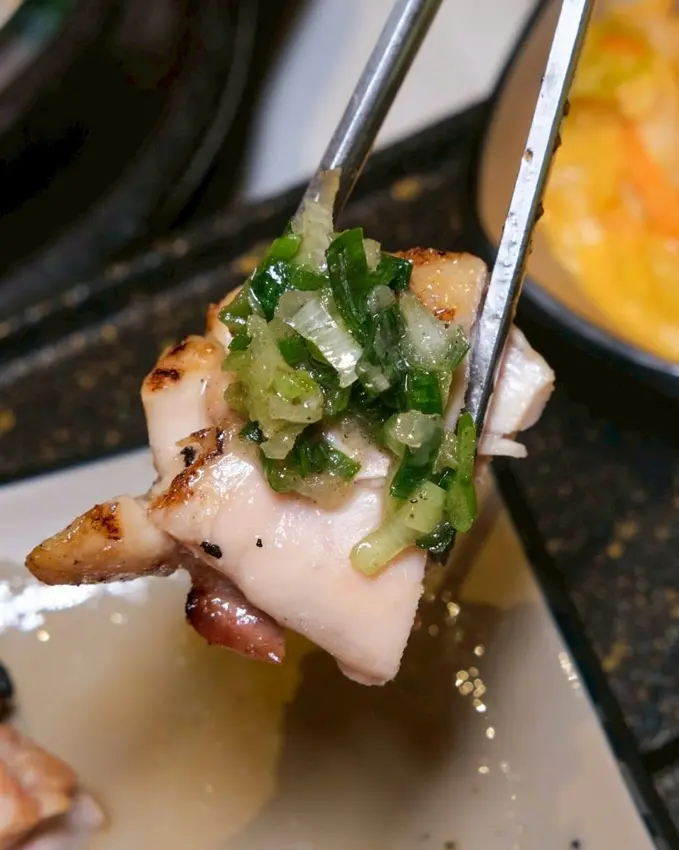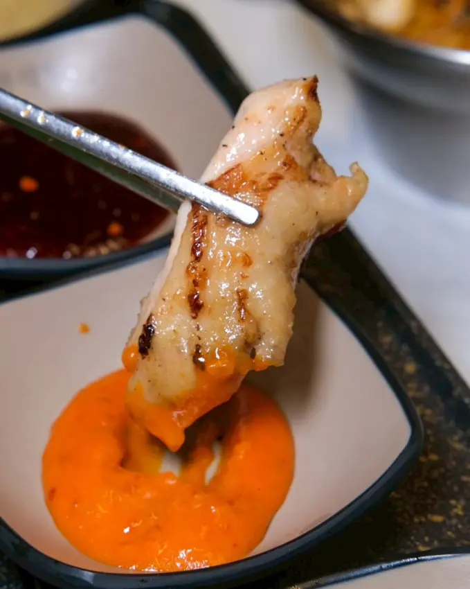 雞松阪吃起來肉感Q彈,包生菜和泡菜一起吃更讚, 雞橫膈膜位於雞隻胸腔和腹腔之間,彈嫩有嚼勁帶有適量油脂,是會越吃越香的類型,兩款都可選擇辣或不辣!