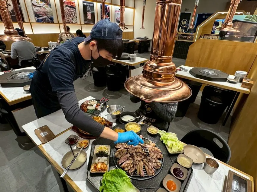 【八角道 韓國炭火烤肉】採用炭火燒肉,火候十足烤起來特別香,店內不忙的時候,店員也會幫你暖心烤肉肉。