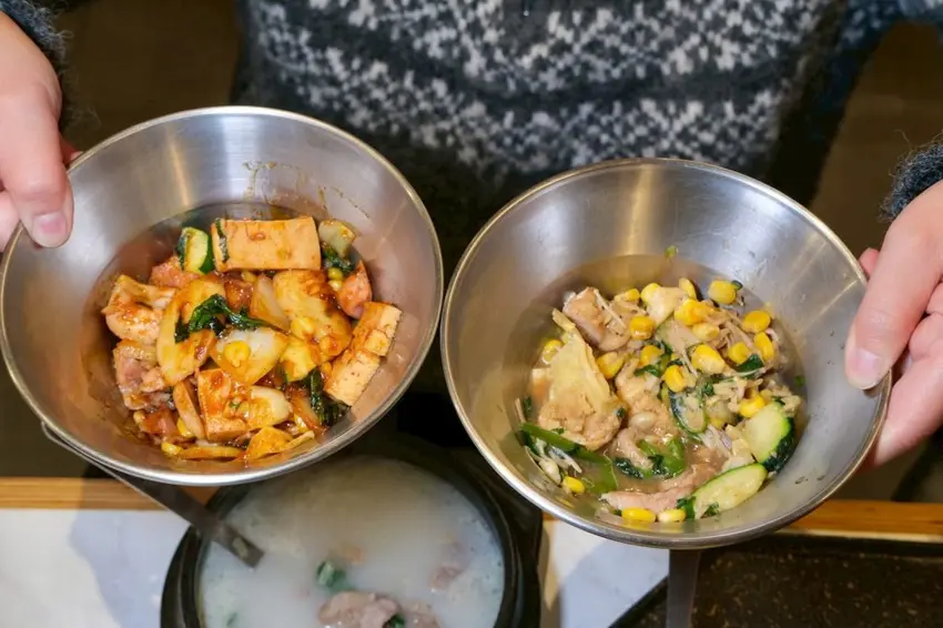 ▼韓式鐵板炒雞(辣椒、玉米、蒜末、蔥末、魚板、豆皮、豆腐、九層塔、金針菇、杏鮑菇、年糕、空心菜、大黃瓜、高麗菜),會由服務人員現場拌炒,可以選擇要辣還是不辣,夠味討喜讓人停不下來!