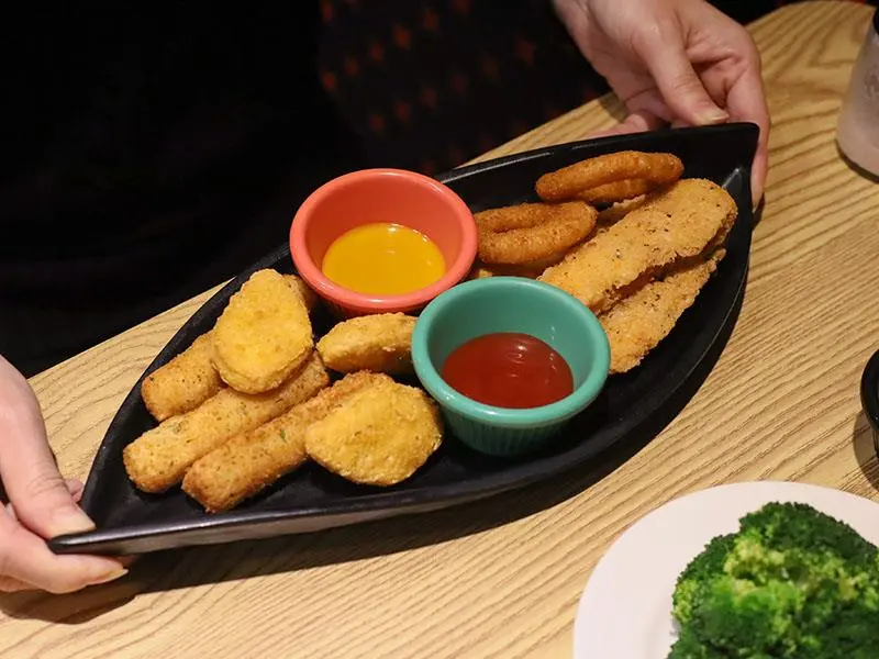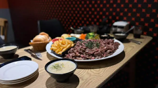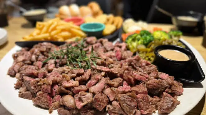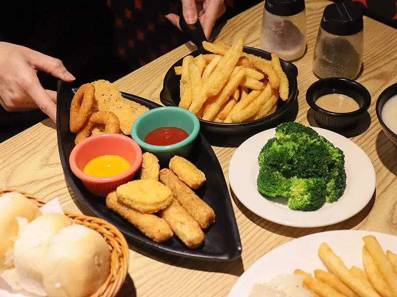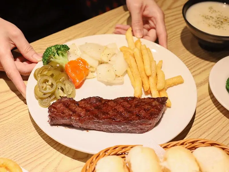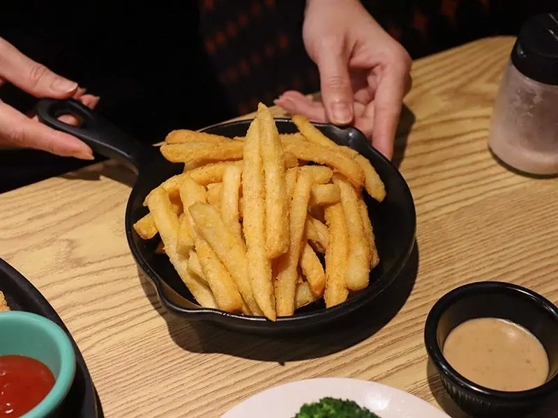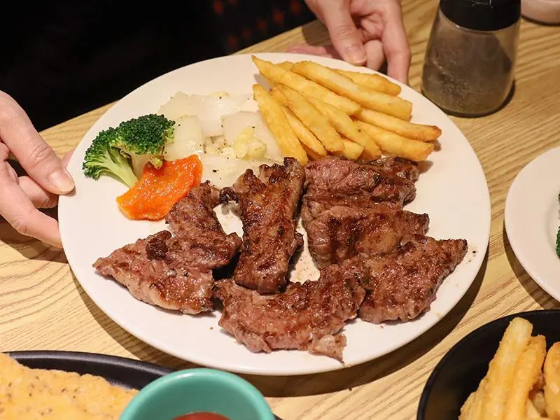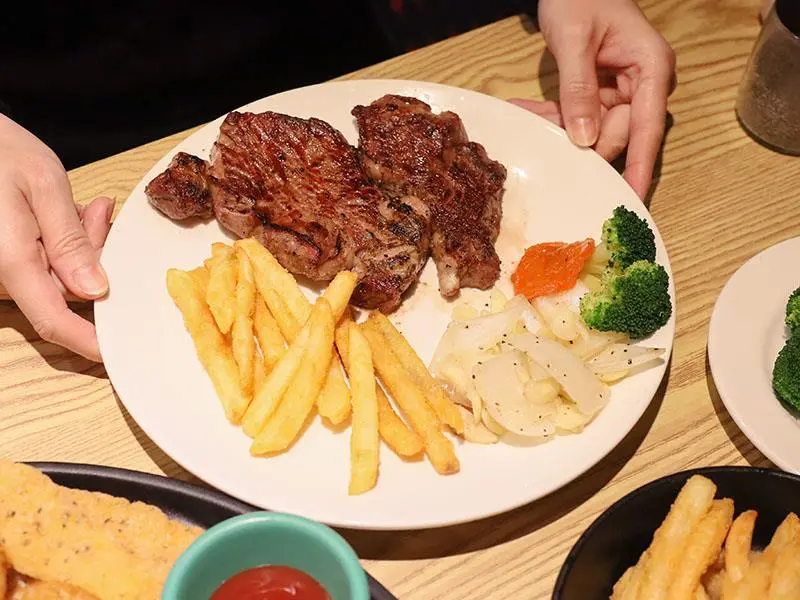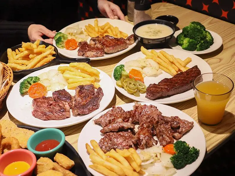 如果你們是多人聚餐或是自認食量驚人,店家還推出了「大胃王分享餐」,包含超大份量的肉盤以及四份附餐與小拼盤,適合 2 到 4 人一起挑戰。此外,這裡的炸物表現也不馬虎,無論是黃金脆薯、洋蔥圈、雞塊還是起司條,炸得金黃酥脆且不油膩,香酥的口感沾上番茄醬或特製醬料,是等待牛排上桌前的最佳開胃點心。想要單純享受大口吃肉的快感,來這裡準沒錯。