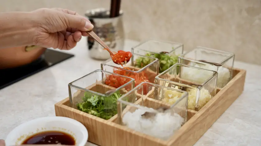 入座後服務生會送上醬料拼盤,可依照自己的口味準備沾醬,習慣吃重鹹、愛吃辣的朋友,可以來點辣椒、蔥薑蒜~