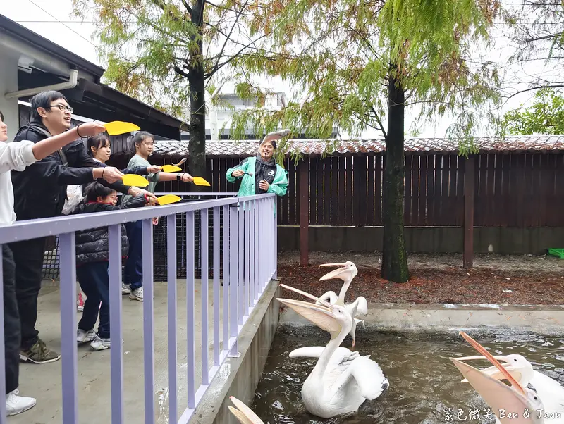 在工作人員引導下,大家拿著裝著魚的小桶子,一聲令下,同時將小魚拋出,鵜鶘們張開大嘴接住小魚,模樣超逗趣的