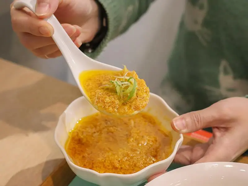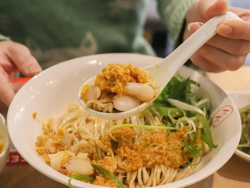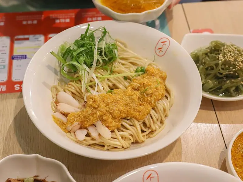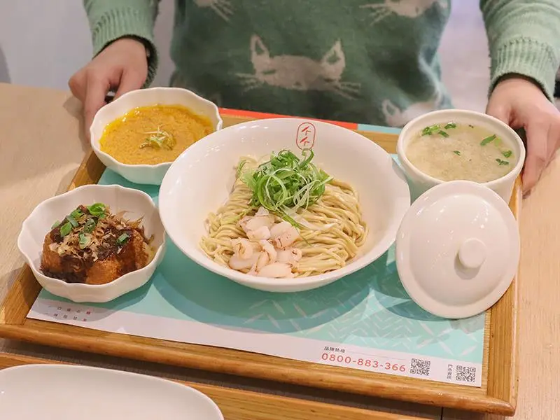 首先登場的是「蟹黃流金拌麵」,這碗麵簡直是為了蟹黃控量身打造。麵體上方豪邁地淋上了重達 100g 的蟹黃精華醬,並搭配鮮甜的蟹腳肉點綴,整碗麵彷彿披上了一件金色的奢華外衣。趁熱將麵條拌開,每一根麵條都能完美吸附濃郁的蟹黃醬汁,入口後那股鮮香在嘴裡爆發,油脂感豐富卻不膩口。建議大家一定要趁熱享用,才能品嚐到蟹黃最完美的香氣與滑順口感,搭配套餐升級更是滿足。
