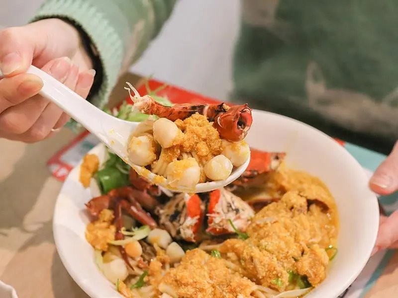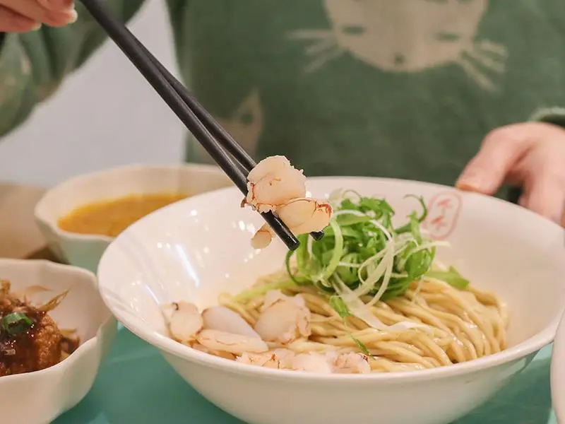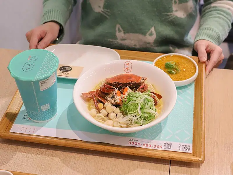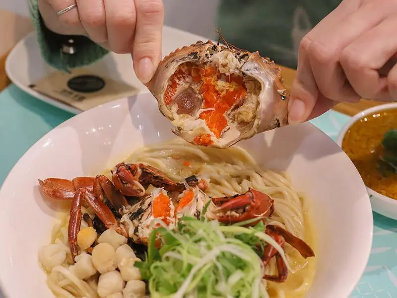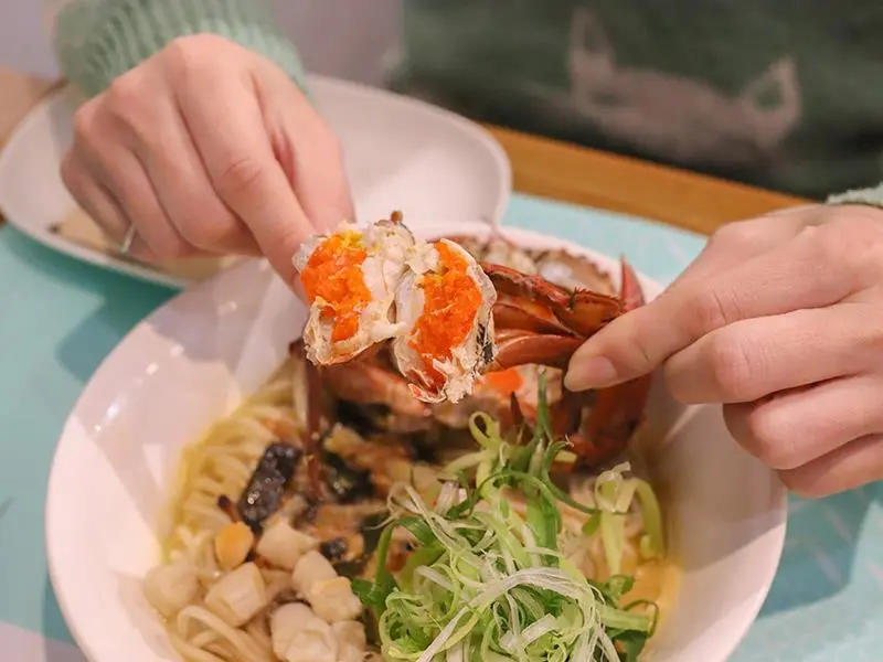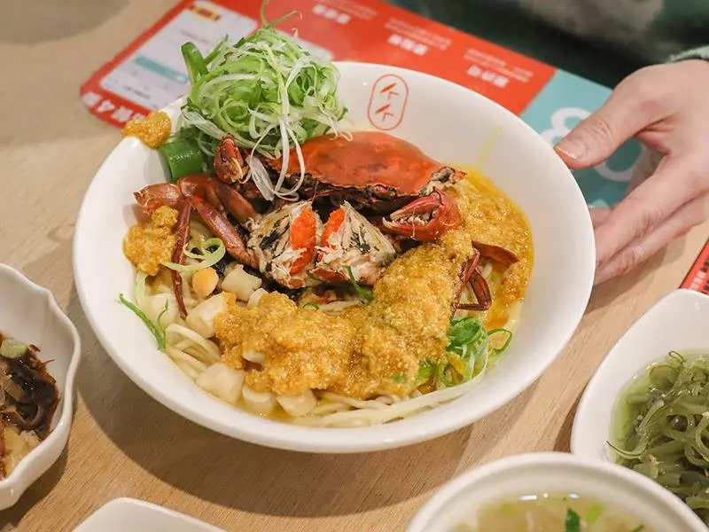 新竹金山街「墨竹亭」推出奢華蟹黃系列,整隻紅蟳與爆量蟹黃醬正面對決,是竹科園區午晚餐的質感麵食首選。