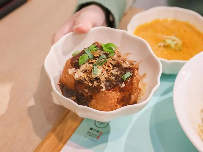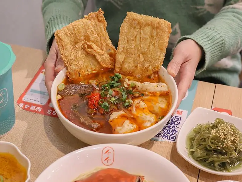 除了海鮮新品,經典回歸的「御制巴渝小麵」也是不容錯過的美味。湯頭走的是道地川蜀風格,辣中帶酸的層次感非常豐富,並非單純的辣油刺激,而是一種溫喉的酸香,特別適合粉領族的輕味蕾。碗裡的配料相當豐富,包含滑嫩的抄手、入味的鴨血與爽脆的榨菜。其中最讓人驚豔的是兩片大豆皮,吸滿了酸辣湯汁後,口感軟中帶韌、酥脆可口,存在感極高,在冷冷的天氣裡吃上一碗,暖身又開胃。