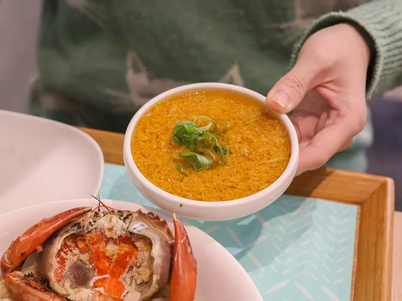 如果你想要視覺與味覺的雙重震撼,那麼「蟹黃紅蟳拌麵」絕對是首選。一整隻紅蟳霸氣地躺在碗中,氣勢十足,翻開蟹殼可見紅亮的蟹黃與厚實的口感。這碗麵的細節處理相當用心,麵條預先使用了 20g 的蟹黃煨煮入味,再淋上 80g 的蟹黃醬,並加入珍珠貝增添口感層次。入口不僅有蟹膏的濃郁,還有珍珠貝的鮮甜與蟹黃的油脂香氣,鹹鮮交織的豐富滋味一次到位,是令人難以忽視的奢華享受。