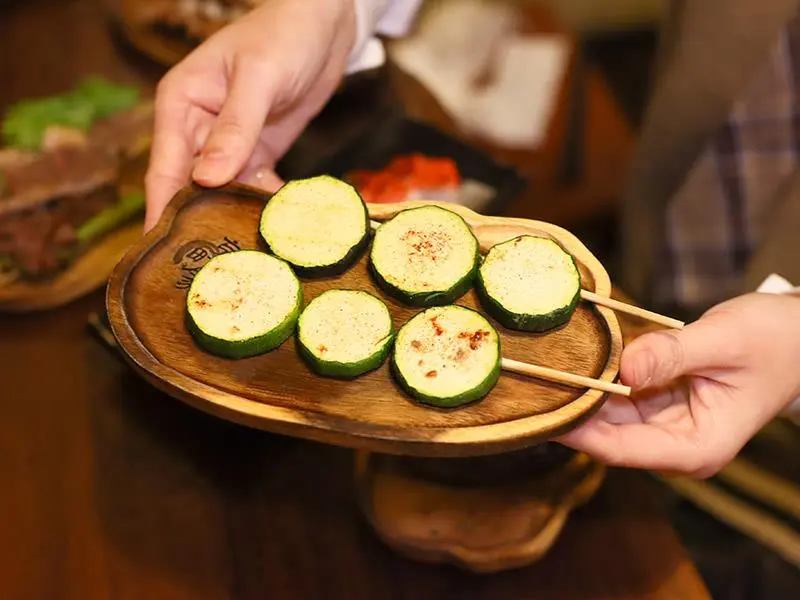 吃了這麼多肉類,需要來點清爽的平衡一下。每次來必點的「元氣燒肉組合」,將炒香的肉片搭配洋蔥、蒜片、小黃瓜與辣椒,豪邁地包進新鮮生菜裡一口咬下,蔬菜的清脆瞬間化解了肉膩感。蔬菜烤物也相當精彩,「鹽烤櫛瓜」切面微焦卻保留了豐富水分;「1/2 辣味噌日本茄子」則是大人的口味,辣度層次分明且帶有濃郁的發酵香氣,後勁十足。還有口感滑順的「明太子山藥」,鹹香不膩,兼顧了口感與風味。