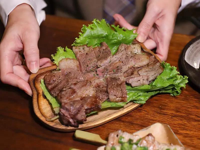 京町家的串燒靈魂在於堅持「炭火直烤」,不依賴厚重的醬汁調味,而是考驗師傅對火候的精準掌控。首推「澳洲穀飼黑牛雪花牛排」,切得相當厚實,經過炭火洗禮後表面帶有迷人的焦香,內裡則保留了粉嫩的肉色。入口時能感受到肉質柔軟中帶點彈性,隨著咀嚼,牛肉本身的鮮甜肉汁在口中慢慢散開。這種直球對決的烹調方式,完美呈現了優質肉品的原汁原味,是肉食主義者不可錯過的開胃大菜。