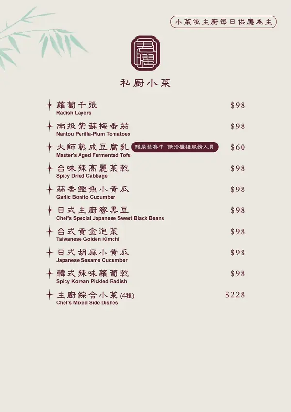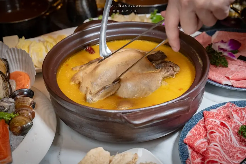 店內的鎮店之寶非「人蔘花膠全雞竹笙雞湯」莫屬,這是一道幾乎桌桌必點的人氣佳餚。選用珍貴的人蔘、金華火腿、干貝、豬腳、台灣白玉土雞以及十多種中藥材,耗時一天一夜精心熬煮而成。金黃色的湯頭表面浮著一層誘人的膠質,入口濃郁滑順,喝完嘴唇還會留有黏黏的膠原蛋白感。為了完美呈現這道湯品,老闆特地選用日本擁有兩百年歷史工藝的「萬古燒」陶鍋盛裝,利用其優異的保溫特性鎖住食材最原始的鮮甜風味。