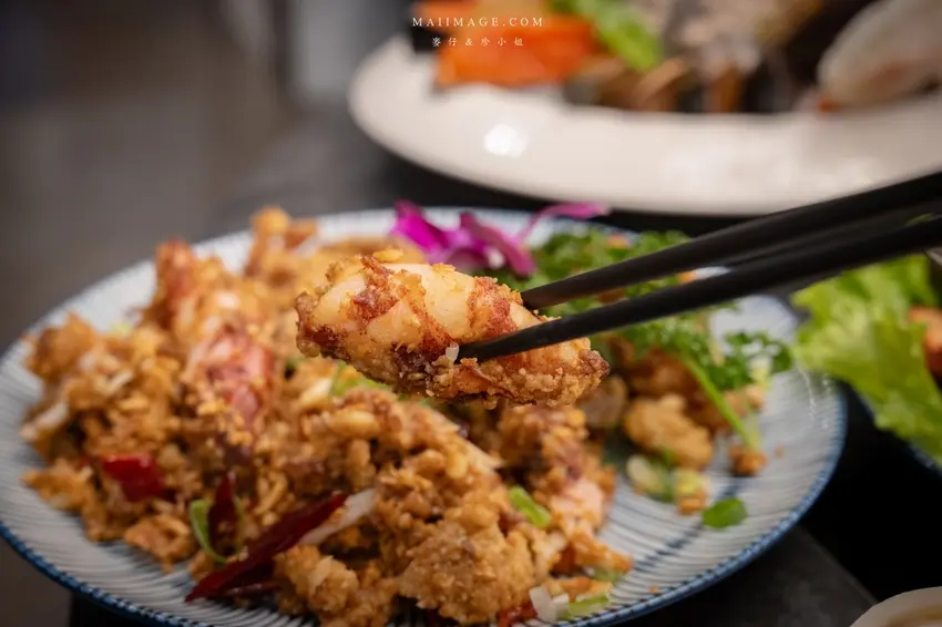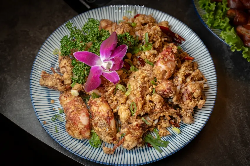 這裡的主廚熱炒料理也不遑多讓,是搭配雞湯的最佳綠葉。「主廚紹興醉蝦」酒香入味,蝦肉彈牙鮮甜;「主廚酥炸小卷」外層裹上輕薄麵衣炸至金黃酥脆,內裡保留了小卷的多汁與甜度,搭配蒜酥爆炒後鹹香涮嘴。還有那道「酥炸台式肥腸」,火候掌握得恰到好處,外皮酥脆不油膩,肥腸內部的油脂保留得宜,沾點椒鹽更是對味。