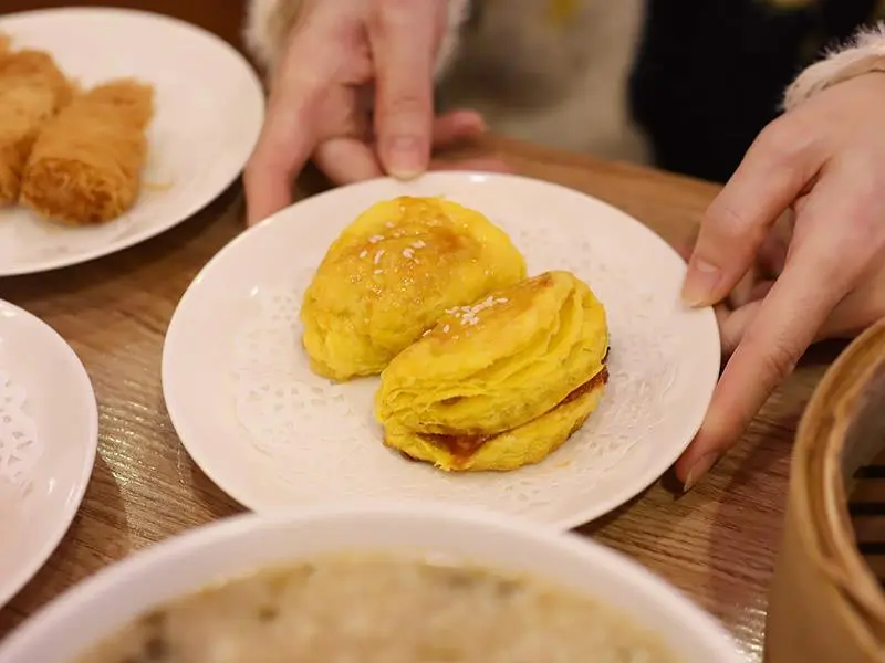 如果要從菜單中選出唯一的「必點之王」,那絕對非「蜜汁叉燒酥」莫屬。師傅展現精湛的手作工藝,將外層烤至層層分明的千層酥皮,輕輕一咬便在口中化開碎裂。內餡的蜜汁叉燒帶有討喜的微甜滋味,保留了適當的油脂讓香氣更加充足,吃完一顆後口齒留香,讓人忍不住想再續盤。這道點心完美體現了港式酥點的精髓,是初訪者不能錯過的鎮店招牌。