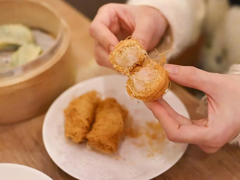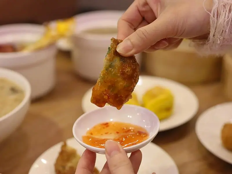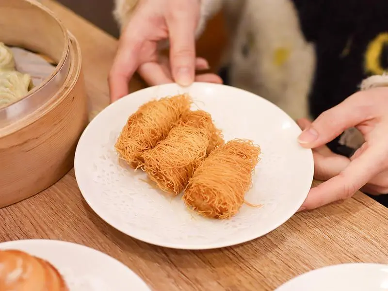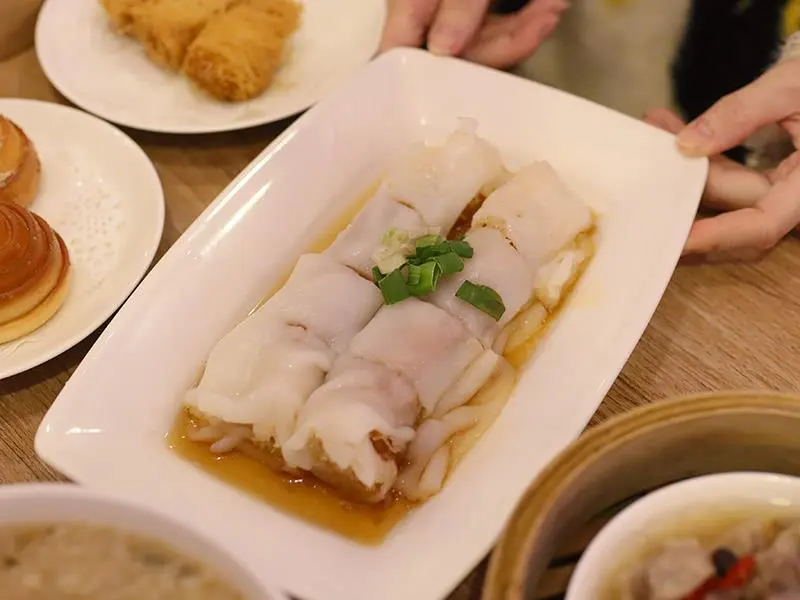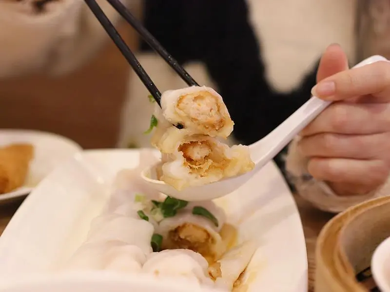 喜歡口感變化的朋友,推薦嘗試「龍鬚鮮蝦卷」。外層裹上細絲般的炸麵衣,炸得乾爽不含油,即便稍微放涼也能維持酥脆口感,內餡的蝦肉更是彈牙有勁。另一道「脆皮鮮蝦蒸腸粉」則是口感的集大成者,滑嫩的腸粉皮包裹著酥脆油條與鮮美蝦肉,一口咬下同時感受到軟、脆、彈三種層次。搭配清爽路線的醬汁,不會蓋過油條的香氣,反而讓吸飽醬汁的腸粉更具風味。