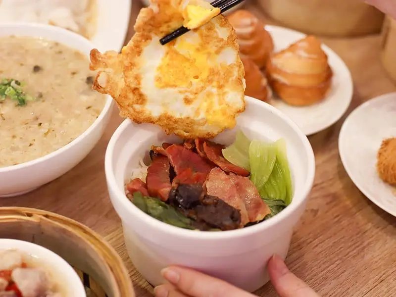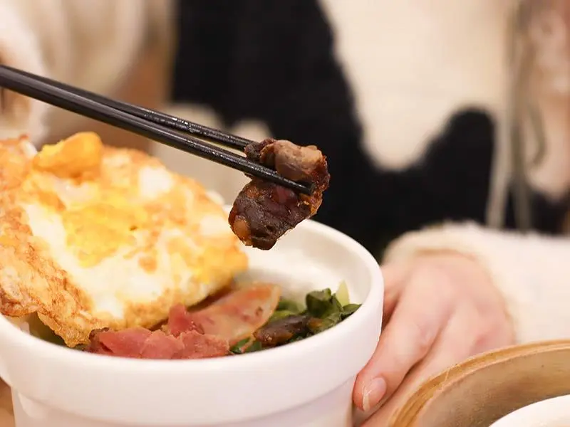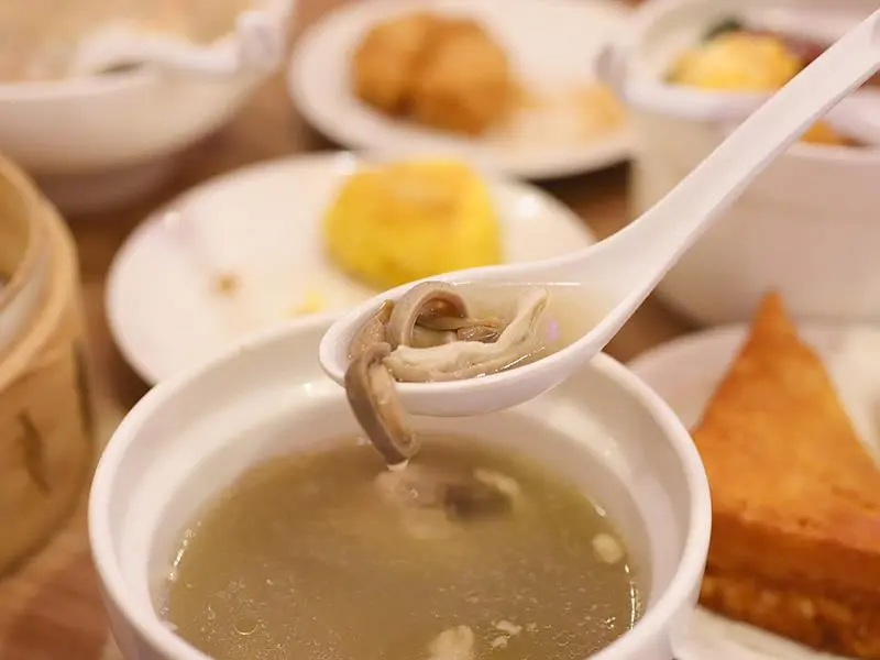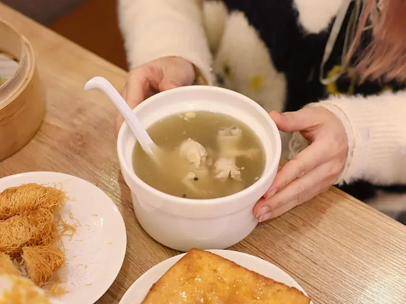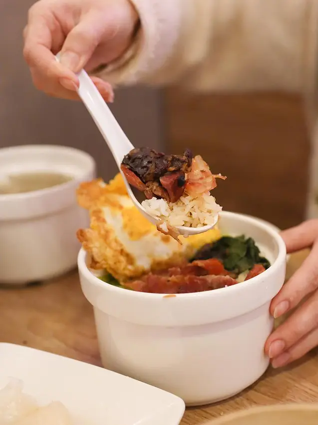 想要吃飽的主食選擇也相當豐富。「叉燒飯加蛋」一次集結了叉燒、香腸與臘腸,份量誠意十足,微甜的叉燒配上香氣濃郁的臘腸,再來一顆荷包蛋,均衡又滿足。湯品部分首推個人式的「粵式胡椒豬肚雞湯」,裡頭豪邁地放了一整隻雞腿,乳白色的湯頭溫潤順口,胡椒顆粒帶來鮮明的香氣卻不嗆辣,搭配口感脆脆的豬肚,在冷冷的天氣裡喝上一碗,全身都會暖呼呼的舒服起來。