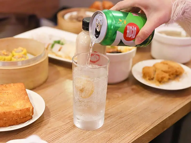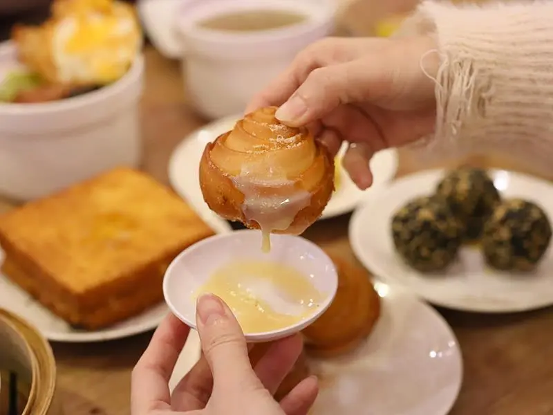 甜點胃也能在這裡得到滿足。「奶黃西多士」將吐司炸至金黃酥脆,切開後流心金沙緩緩流出,鹹甜交織的口味讓人一口接一口,強烈建議趁熱享用。另一款名字充滿詩意的「金屋藏嬌」,外觀看似芝麻球,實則設計了三種口感層次。外層芝麻香氣撲鼻,內層用軟糯的麻糬包裹著濃郁金沙,口感鹹甜分明,作為飯後的完美句點再適合不過。再來杯道地的「港式鹹檸七」,酸鹹氣泡感解膩又過癮。
