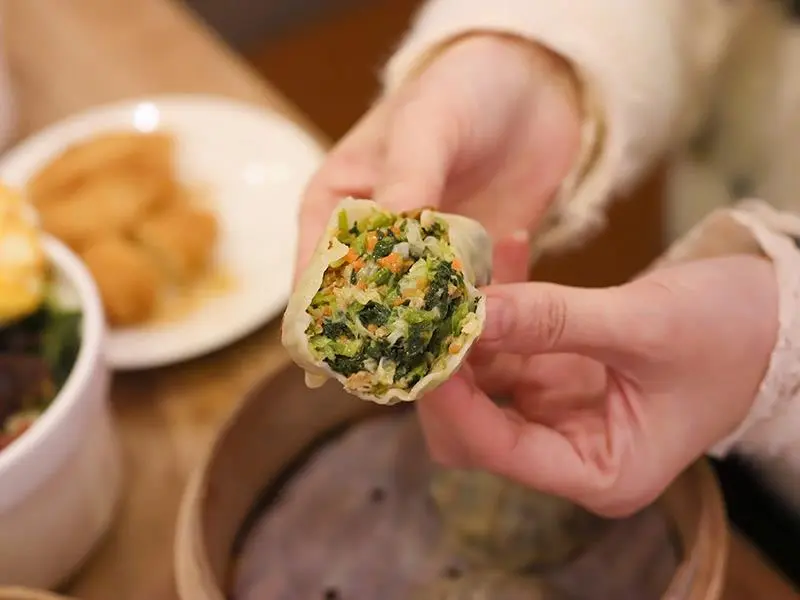 喜歡煎炸小點的朋友,別錯過「韭菜海鮮餅」。外層煎得微微焦酥,咬下後口感 Q 彈,濃郁的韭菜香氣與鮮甜蝦肉完美結合,吃起來一點都不油膩,沾點醬汁風味更佳。而素食友善的「花素蒸餃」也讓人驚艷,內餡包滿了蘿蔔絲、韭菜與紅蘿蔔,皮薄且帶有彈性。調味相當有層次,打破了素餃容易有生菜味的刻板印象,是款連葷食者都會喜歡的清爽選擇。