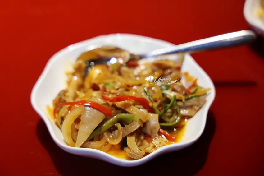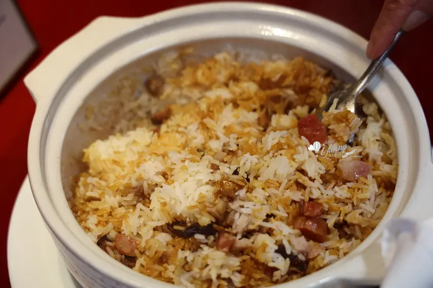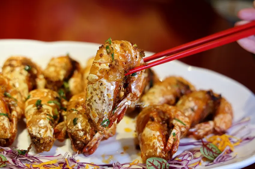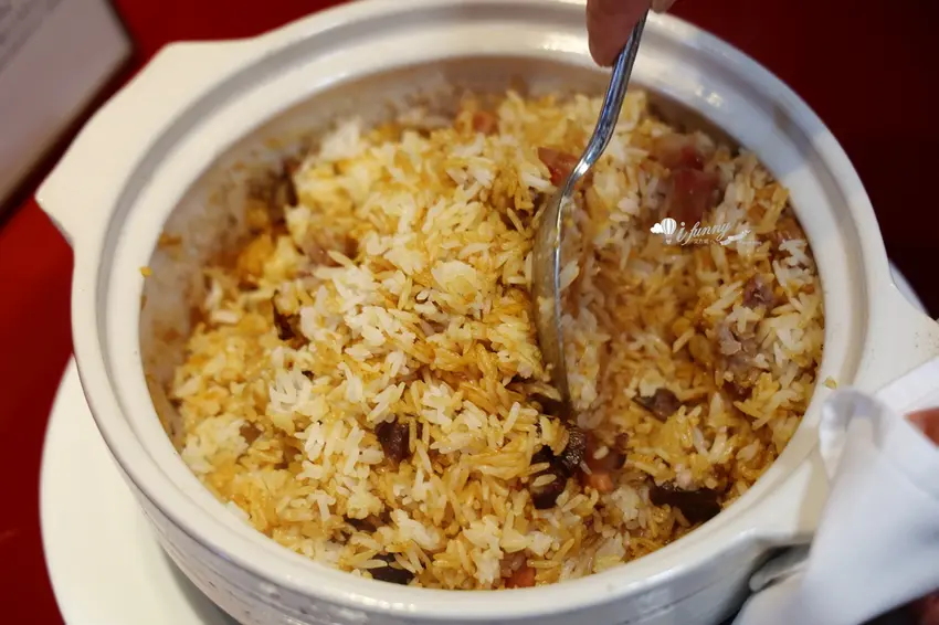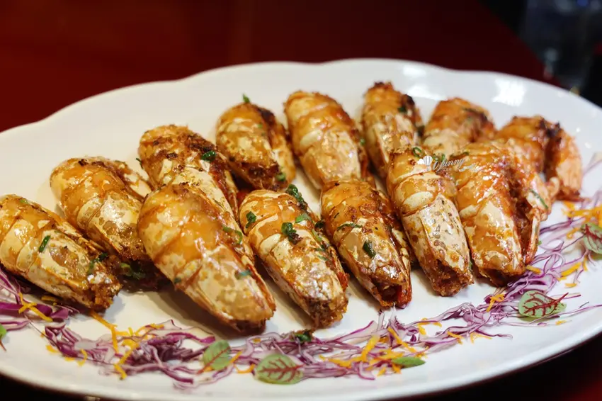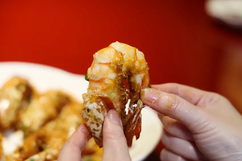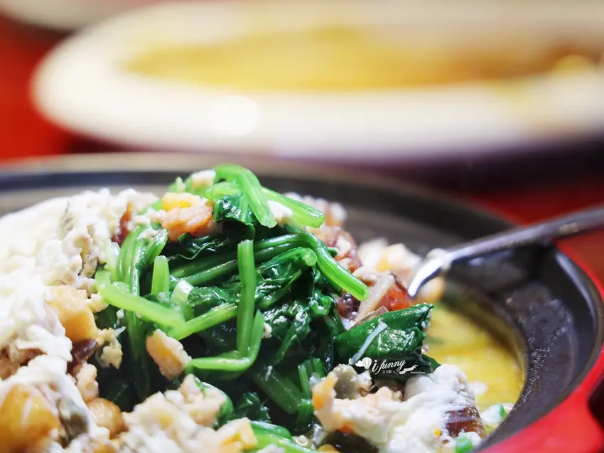 海鮮料理首推「紅油野生大虎蝦」,碩大的澳洲虎蝦肉質緊實 Q 彈,包裹著低溫慢煸的紅油,微辣麻香襯托出蝦肉鮮甜。「芋香臘味煲仔飯」則是大甲芋頭與廣式臘味的完美結合,米粒分明且吸滿臘味油脂。最精華的是砂煲底部的焦黃鍋巴,吃起來像爆米香般清脆不焦苦,芋頭綿密與臘腸酒香交織,是整頓飯最飽足的完美收尾。