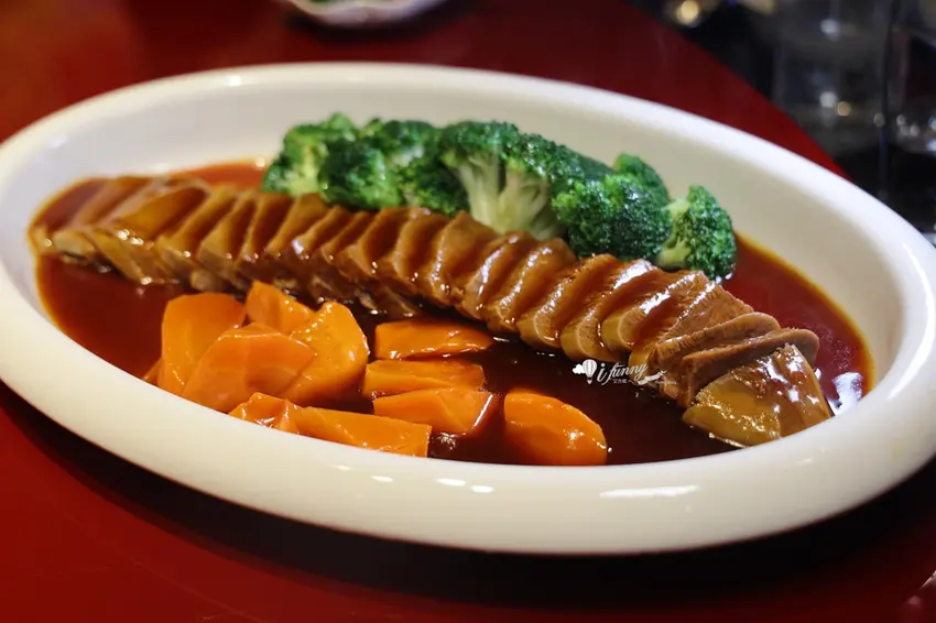 這道「紅酒燒澳洲牛舌」完美展現了法式手法與粵式燉煮的結合,整條牛舌霸氣上桌,視覺效果十足。主廚利用蔬菜與紅酒慢燉,讓牛舌呈現出前段脆彈、中段細緻、尾段入口即化的豐富層次。醬汁收得極濃,呈現誘人的琥珀色光澤,像絲絨般緊緊包裹住肉塊,濃郁的醬香與肉汁噴發,被譽為超級白飯殺手,讓人忍不住想多吃好幾碗。