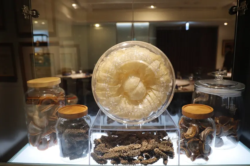 蔬菜料理「瑤柱金銀蛋時蔬」湯頭是一大亮點,融合了鹹蛋與皮蛋的特殊香氣,搭配軟綿的炸蒜頭與瑤柱絲提鮮。菠菜吸滿了金銀蛋湯汁,蔬菜的清甜剛好中和了鹹蛋的厚重。最後的甜品「養顏冰糖燉燕窩」保留了燕窩完整的膠質結構,口感細膩滑順、風味純淨,喝完彷彿整個人都變美了,為這場頂級饗宴畫下完美的奢華句點。