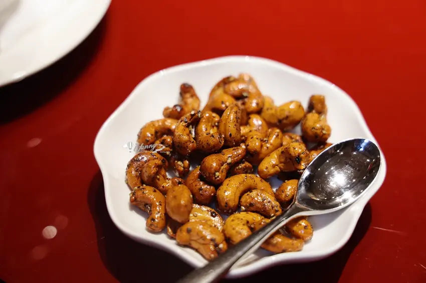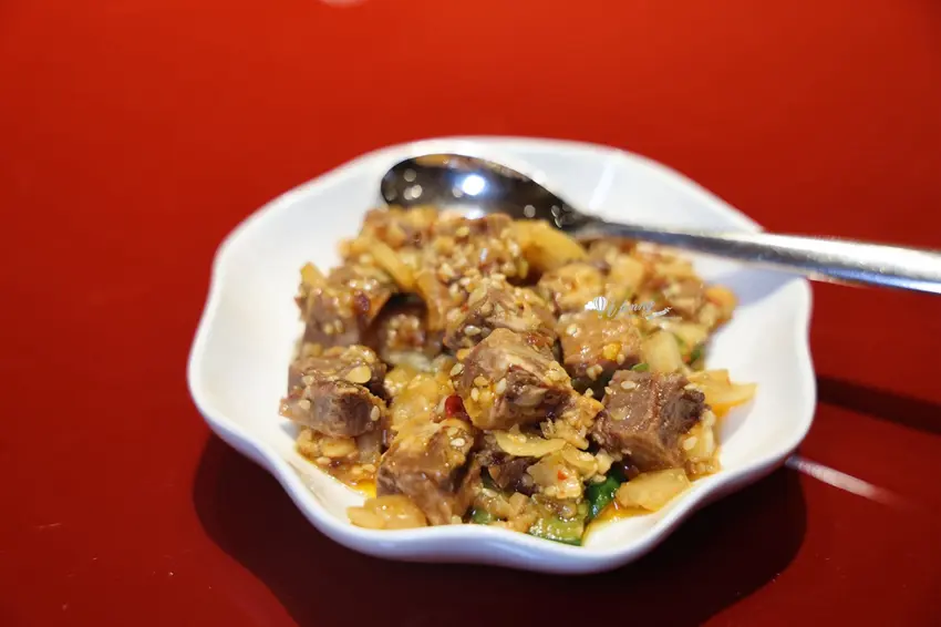 迎賓五色小菜盤中的蘿蔔糕外皮焦香酥脆,口感嫩滑如漿,搭配乾爽蒜酥香氣迷人。熱菜「百花油條拼冰花骨」更是一絕,油條包裹著摔打過的鮮蝦漿,口感 Q 彈鮮甜;冰花骨則是京都排骨的進化版,裹上一層如琉璃般的冰糖脆皮,咬下後外酥內嫩,肥而不膩的肉質與糖衣的甜度完美平衡,鹹甜交織的滋味令人回甘明顯。