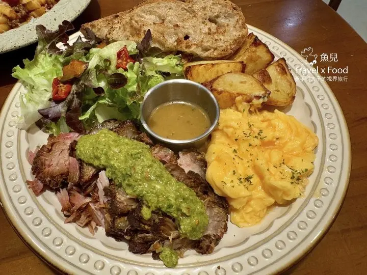 慢烤手撕豬肉,口感鮮嫩,與青醬組合堪稱一絕,創意十足啊!與薯塊、炒蛋一起,整份吃完讓人感到相當滿足~這可是每日限量供應,晚來沒有。