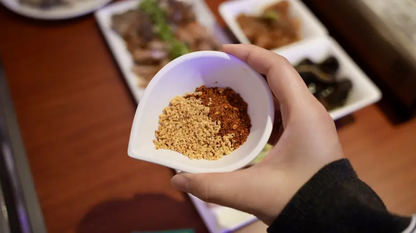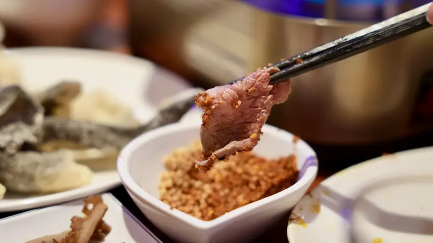 溫體牛肉只要涮個三秒,呈現粉紅色就能享用,入口有濃厚的牛肉香氣,真的非常美味,推薦搭配「乾碟」享用,多了花生的香氣,更有層次而且可以降低辣度唷!