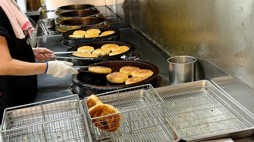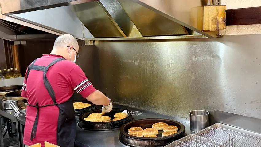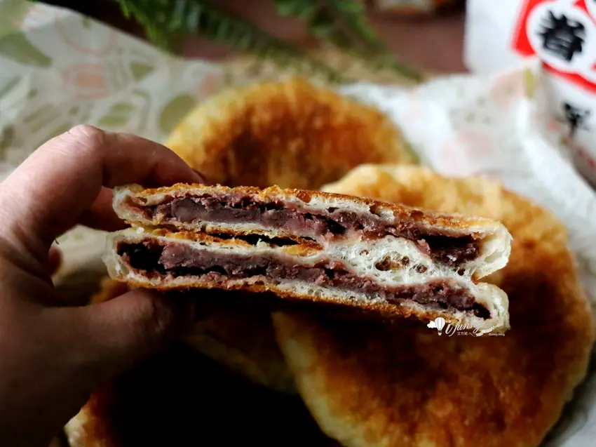 喜歡重口味的朋友不能錯過「韭菜餅」,鮮嫩的韭菜搭配吸飽湯汁的冬粉,吃起來帶有滑溜彈牙的口感。雖然是油煎製作,但韭菜特有的清香辛味會中和油膩感,咬開時還會有微微的溫熱菜汁流出,相當過癮。若想來點甜食收尾,「紅豆餅」是絕佳選擇,薄脆的餅皮包裹著均勻鋪平的紅豆沙餡,豆沙綿密且帶有顆粒感,甜度控制得宜不膩口,是款適合作為下午茶的美味甜點。