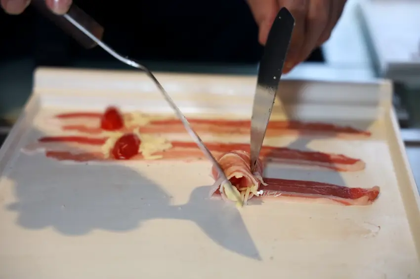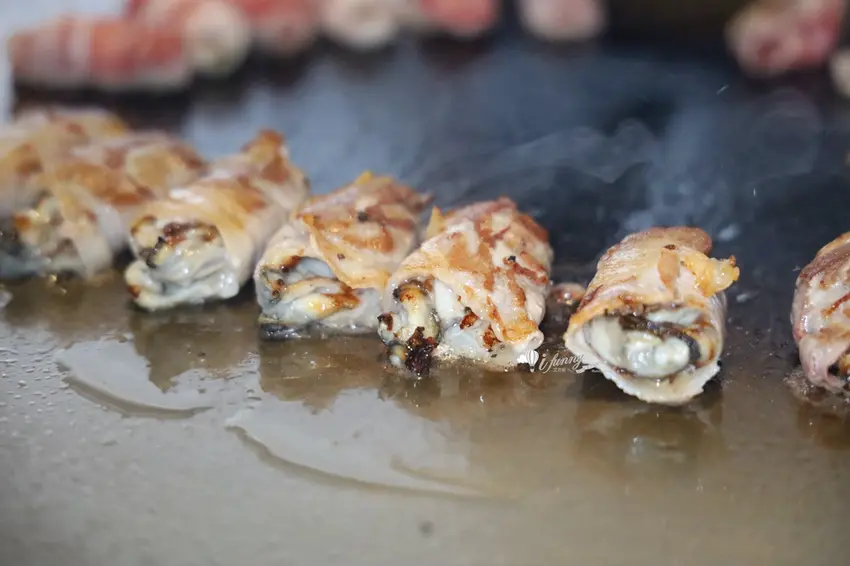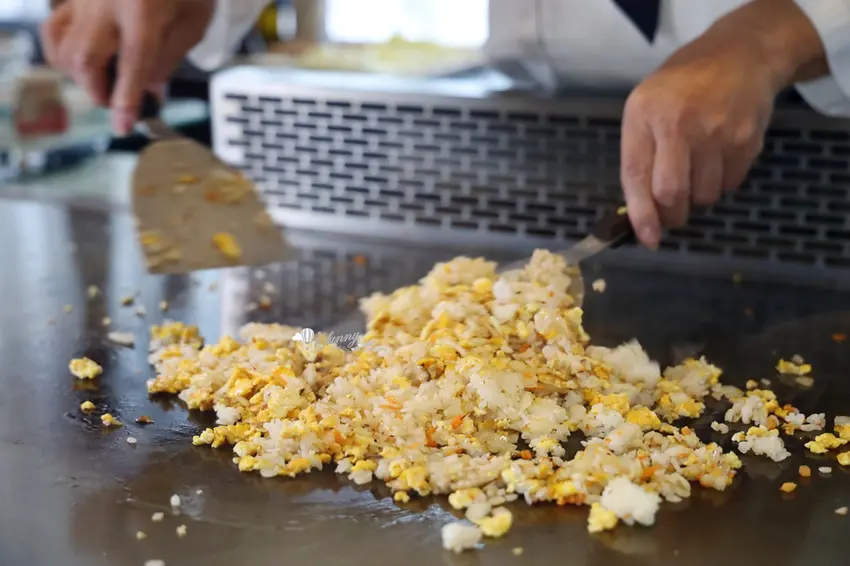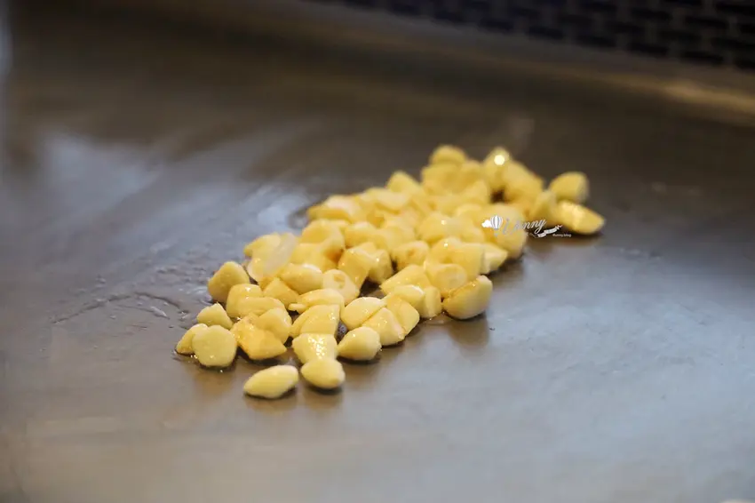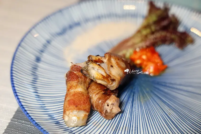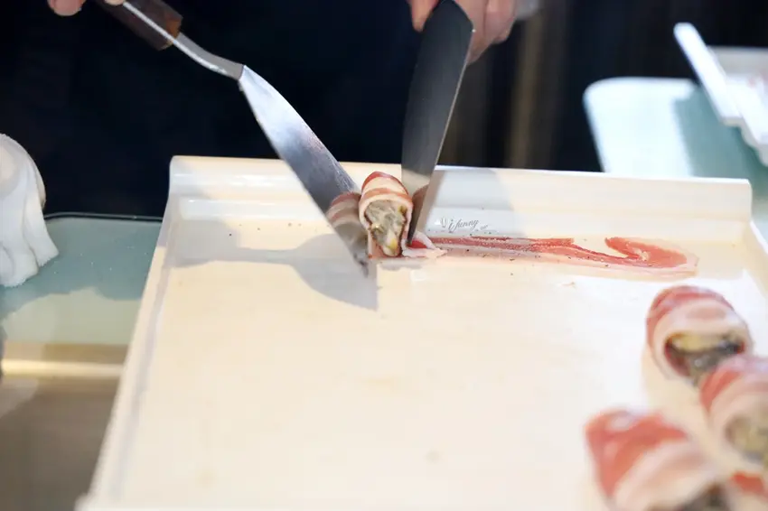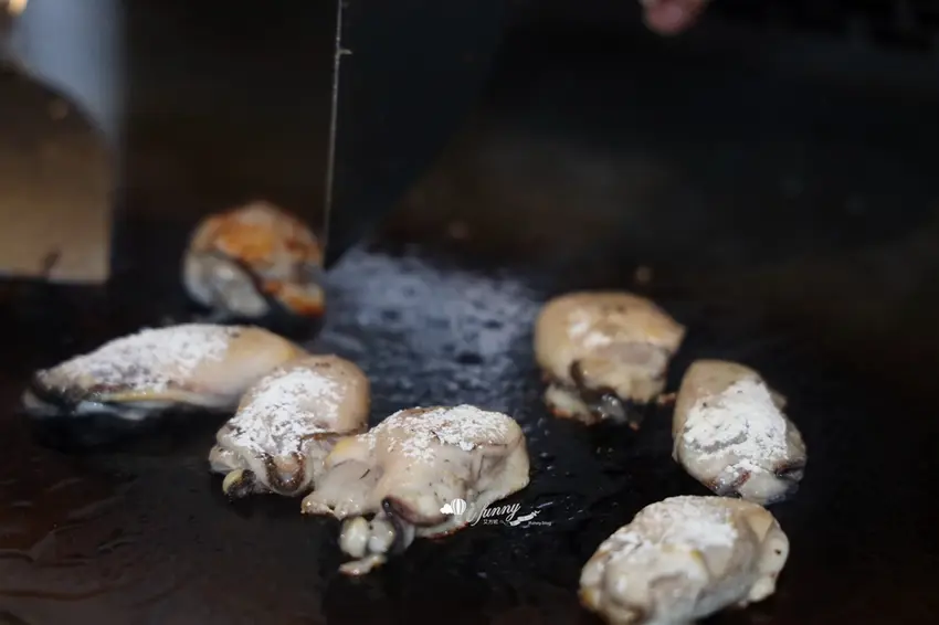 主餐「天使魔鬼」展現了師傅的創意,以五花肉分別包裹廣島牡蠣、番茄起司與剝皮辣椒。高溫逼出五花肉的油脂香,一口咬下分別爆出牡蠣的海洋鮮甜、起司番茄的解膩酸香以及剝皮辣椒的微辣甘甜。主食「粒躍黑金」則是視覺與味覺的雙重享受,師傅在鐵板上飛舞雙鏟炒出粒粒分明的黃金炒飯,靈魂在於加入特製皮蛋醬與大量蒜末辣椒,皮蛋的濃郁膏香與辛香料的顆粒感,在口中激盪出絕妙滋味。
