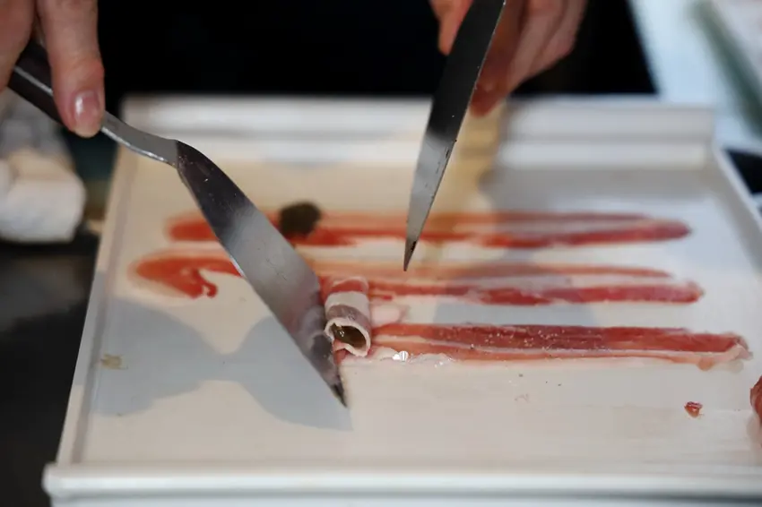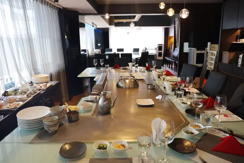 一踏入店內,寬闊的玄關與整面壯觀的紅酒牆映入眼簾,展現出沉穩且具質感的氛圍。這裡提供優秀的餐酒搭配服務,讓美食與美酒相得益彰。座位區除了開放式的鐵板前座位,能近距離欣賞師傅精湛的手藝外,還設有 10 人包廂與 24 人獨立空間,並配備簡報、音響甚至 KTV 設備,非常適合商務聚餐或私人派對。每桌配有專業管家提供無微不至的服務,讓用餐過程更加尊榮舒適。