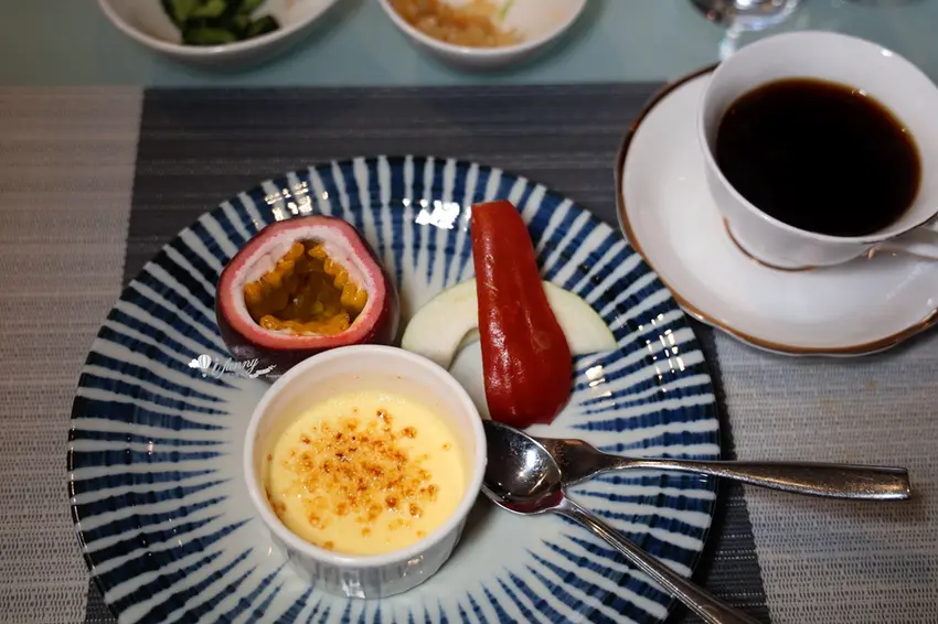 餐後甜點除了高水準的「金露幻象」焦糖烤布蕾與當季水果外,師傅還驚喜招待自製的「三星蔥蔥油餅」。鐵板乾煎至表皮如餅乾般酥脆,內裡保留麵勁與大量三星蔥的清甜湯汁,好吃到想買冷凍包回家。我們另外加點的「北巔紅玉」活體北寄貝,受熱後釋放濃郁原汁,肉質前段脆口後段軟糯,底層粉絲吸滿精華,完全展現了頂級食材的純粹美味。