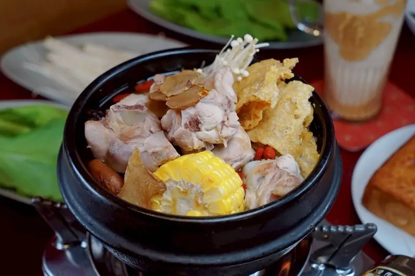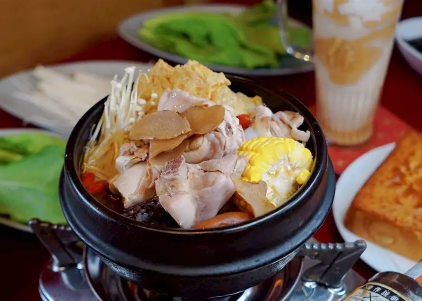 有春茶館的經典麻油雞鍋是一道一年四季都能點的經典鍋物,無論春夏秋冬,都能帶來暖心的麻油香氣,讓人一吃就暖上心頭。隨鍋會附上白飯、時蔬、沾醬以及仙草凍。