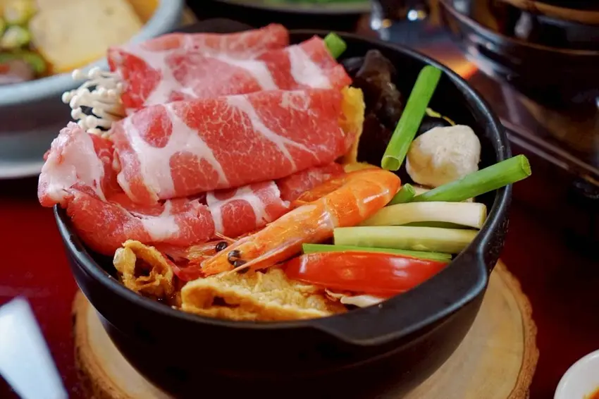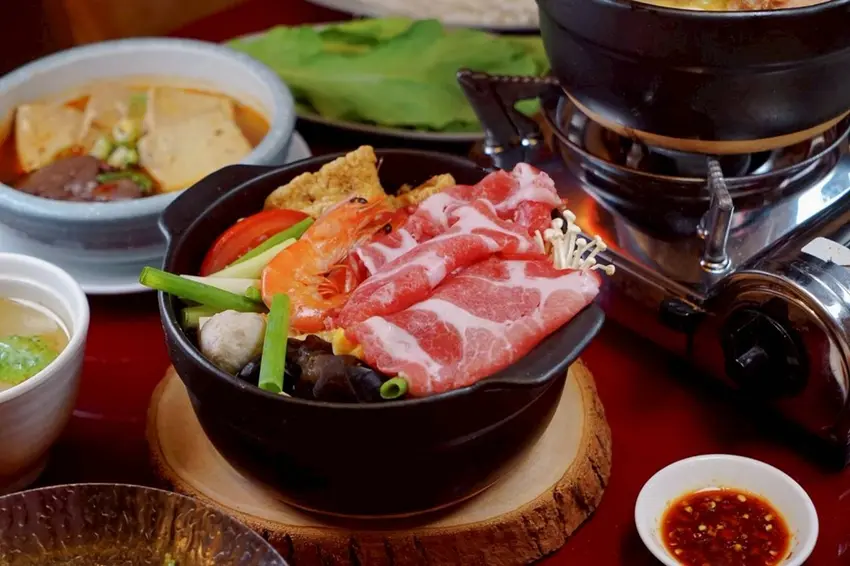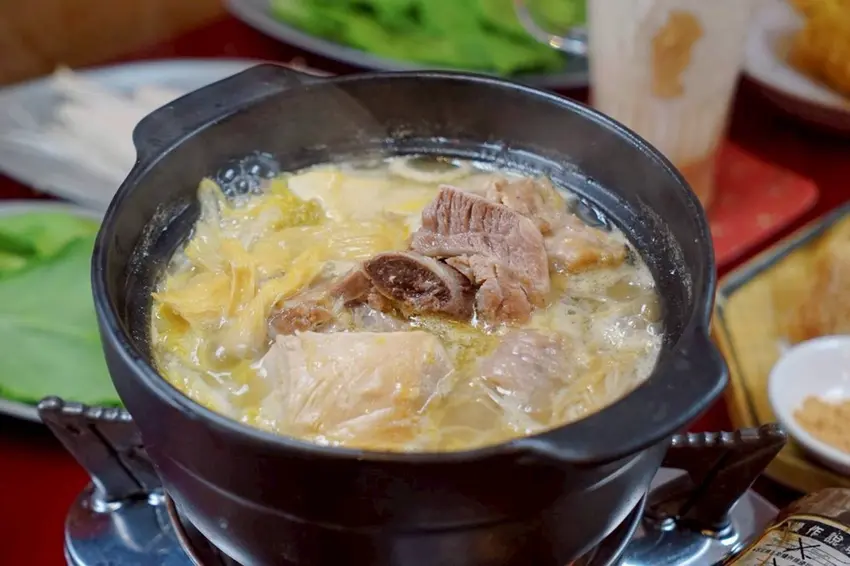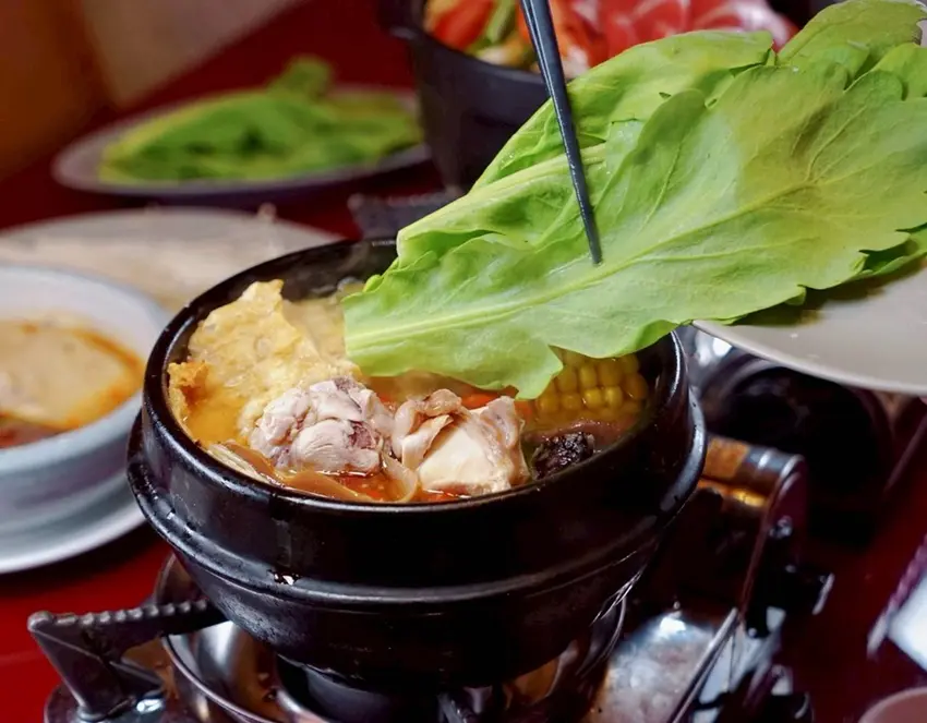 陶鍋濃白雞湯是這次菜單中新加入的鍋物選項,一上桌就能感受到湯色的厚實感。湯底以小米椒為風味基礎,經過長時間慢慢熬煮,整體風味濃郁卻不厚重。因為加入了酸菜,湯頭多了一點自然的酸香層次,搭配微微的辣度,喝起來相當開胃。