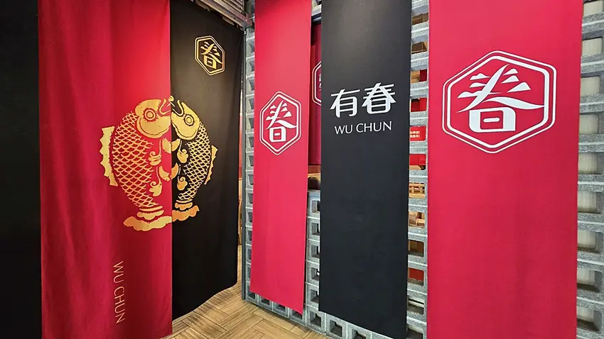 再來我們就來到有春茶館的內觀:紅色布幔上印著有春的標誌,低調卻很有存在感,搭配竹編燈罩與柔和燈光,讓整個空間多了一點傳統茶館的味道,但又不會顯得老派。整體裝潢介於現代與復古之間,是那種台中人會覺得熟悉、坐起來也自在的茶館空間。