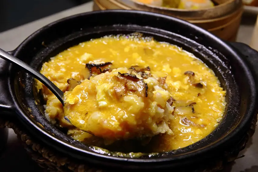 豬豬煲以特選牛奶香米,加入雞湯和蟹粉汁慢炊入味,配料有蝦仁、香菇絲與蛋花