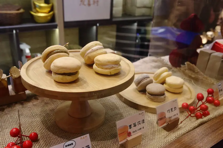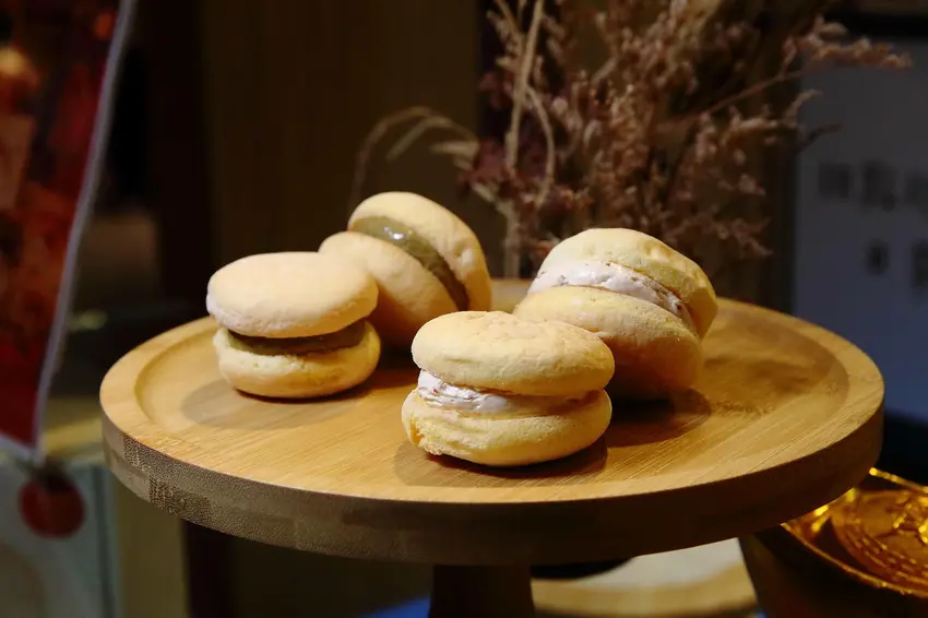 跟法式馬卡龍不一樣:外層帶微酥,柔軟的蛋糕口感,配上特製的內餡共有四種口味