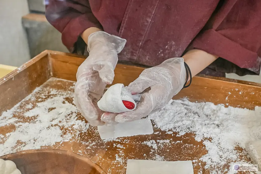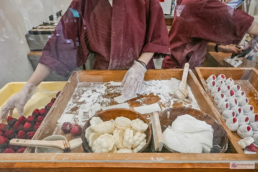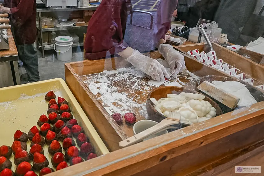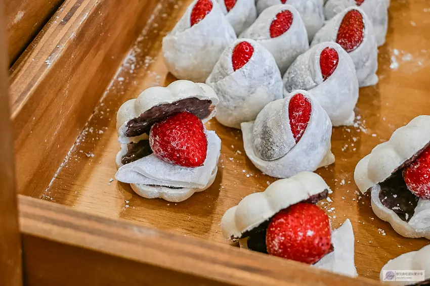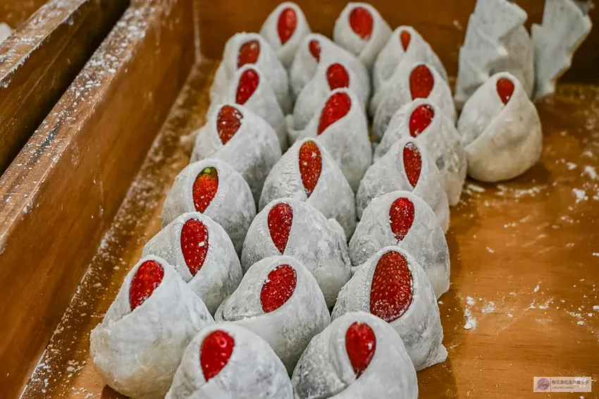 既然是冬季造訪,絕對不能錯過季節限定的「草莓大福」。一顆售價 80 元,但購買四入禮盒平均一顆只要 75 元,CP 值相對較高。米弎豆的草莓大福個頭不小,咬下去瞬間草莓鮮甜的果汁在口中爆開,酸甜度平衡得極好。搭配著甜而不膩的紅豆泥與軟 Q 的麻糬外皮,三種層次在嘴裡完美融合。看著店員現包現做,新鮮度絕對沒話說,是草莓控冬天必吃的夢幻逸品。