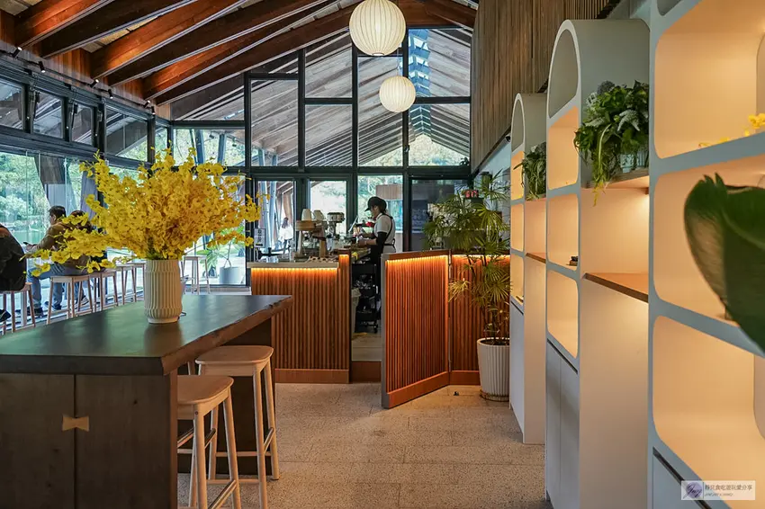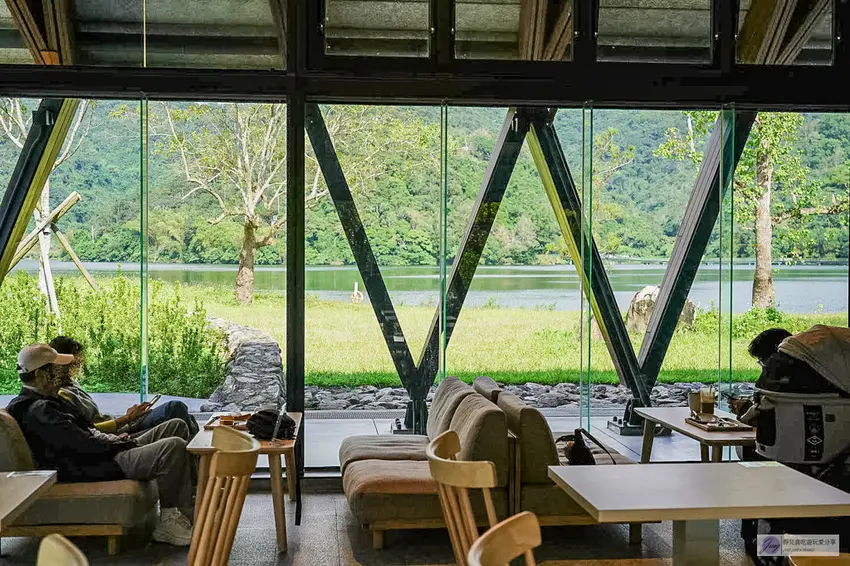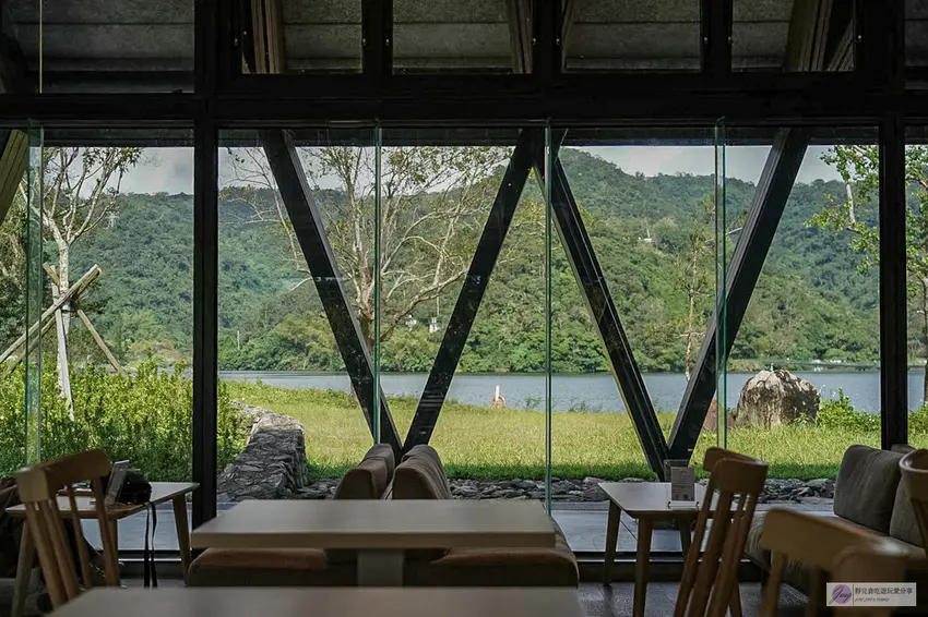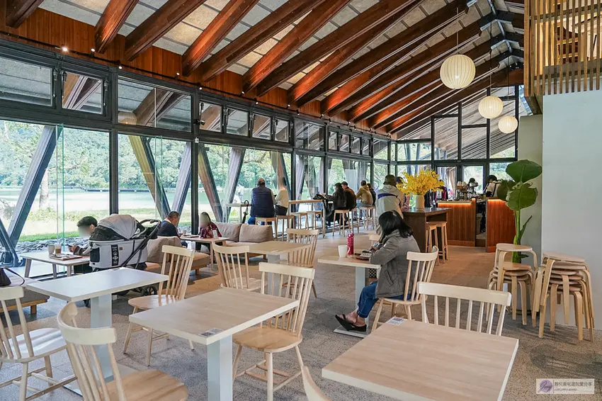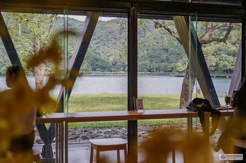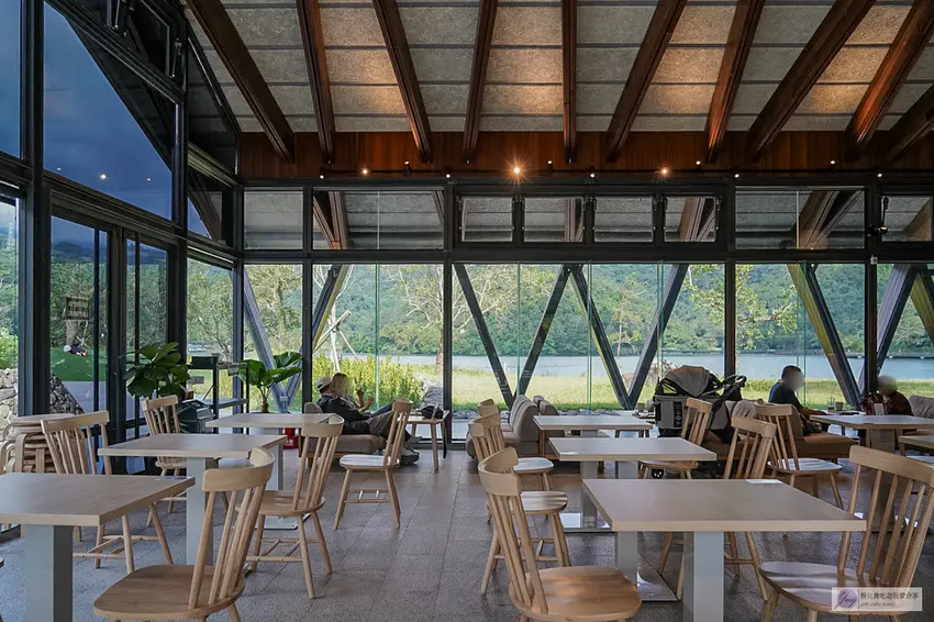 Herbelle Tea 湖畔茶屋整體採用溫潤的木質結構建造,營造出溫暖舒適的放鬆氛圍。搭配大面積的落地玻璃窗,不僅讓室內採光極佳,更將戶外的湖光山色引入眼簾。店內空間相當寬敞,其中靠窗的高腳椅座位區與沙發區是人氣熱點,平日人潮尚可,但假日往往一位難求。坐在高腳椅上,視線直接穿透玻璃眺望寧靜的湖面,那種愜意感真的無可比擬。即使沒有搶到窗邊位置,寬敞的室內設計依然能讓你在各個角落欣賞到美麗的景色。