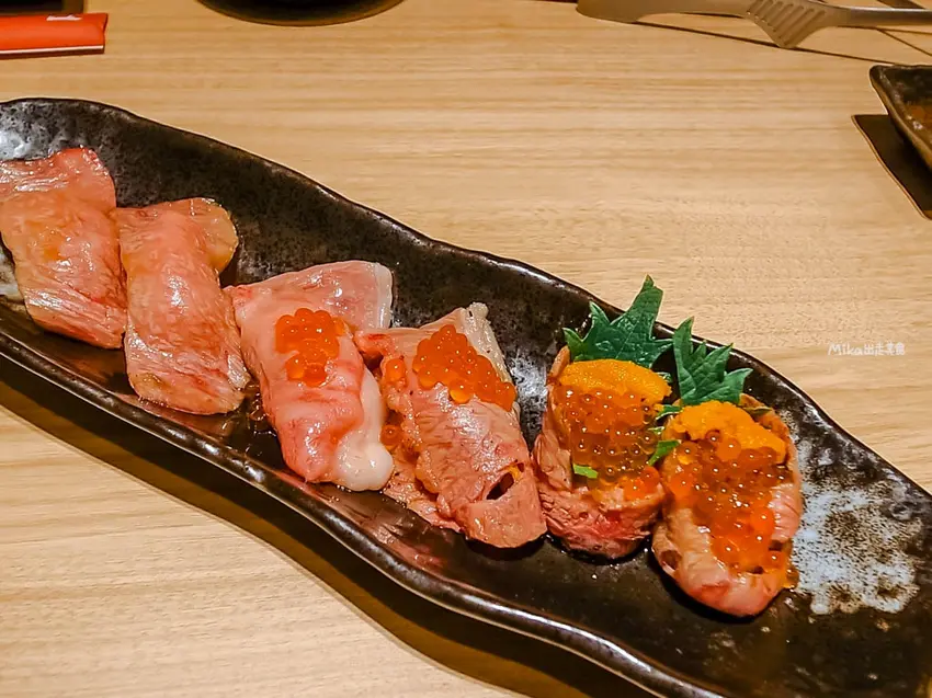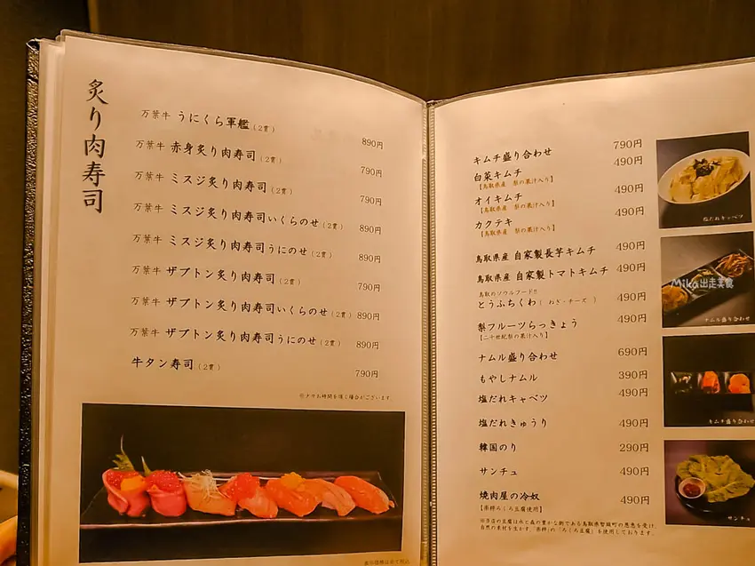 在大口吃肉之餘,配菜的選擇也毫不馬虎。推薦必點「豆腐沙拉」,使用來自鳥取縣智頭町、擁有豐富水源與森林資源製作的「樂粹(ろくろ)豆腐」。天然手工豆腐口感綿密豆香濃郁,搭配生菜超級清爽解膩。此外,也可以點一份「烤時蔬拼盤」來平衡營養,或是嘗試這裡的特色「和牛肉壽司」,雖然看似生食,但入口即化的鮮甜口感讓人驚艷。若想補充澱粉,韓式石鍋拌飯也是不錯的填飽肚子選擇。