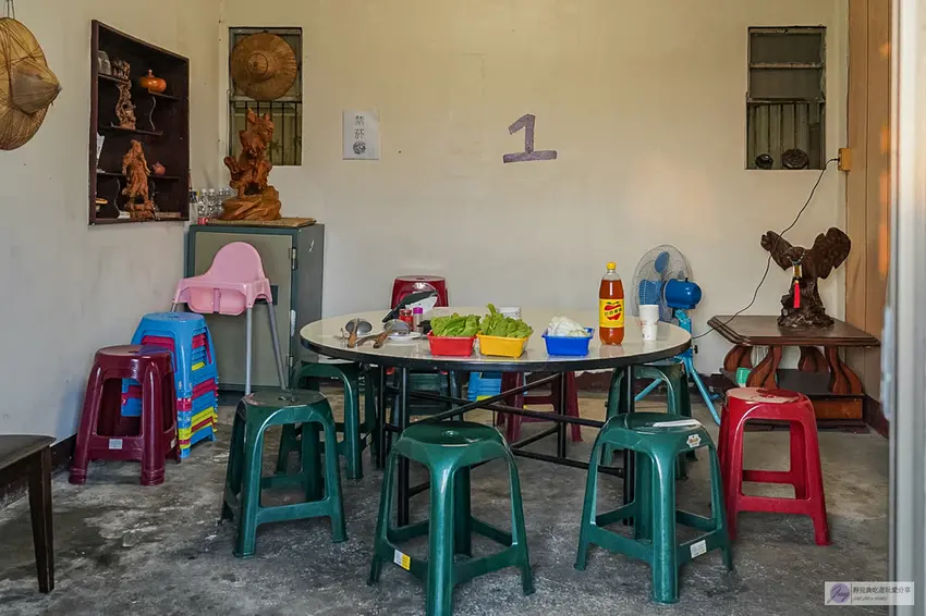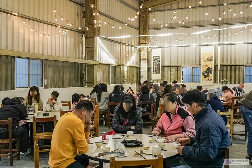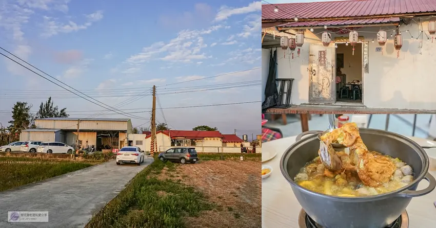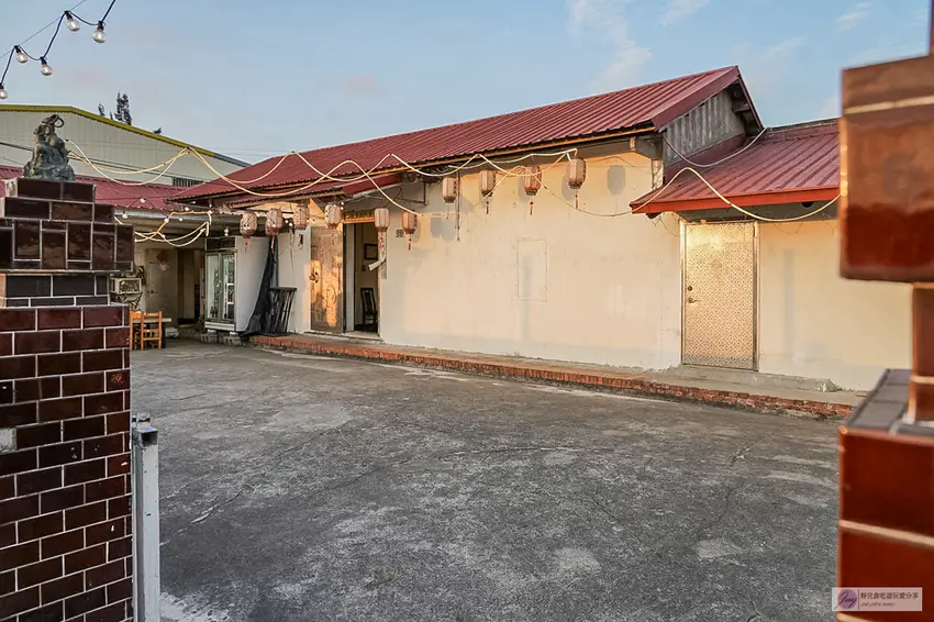 店家地理位置相當隱密,鄰近苗栗苑裡交流道,周圍被廣闊的田園包圍,進來的路略窄需小心會車。用餐區分為鐵皮屋與古樸的三合院,廚房設在正中間的動線十分有趣,彷彿穿越到別人家作客。三合院前還畫有跳格子,充滿濃濃的懷舊童趣,讓小朋友在候位或吃飽後也能開心玩耍。保留原始結構的紅磚老宅搭配大紅燈籠,無論是白天的古樸寧靜還是夜晚的浪漫燈火,都營造出獨特的台式圍爐氛圍。
