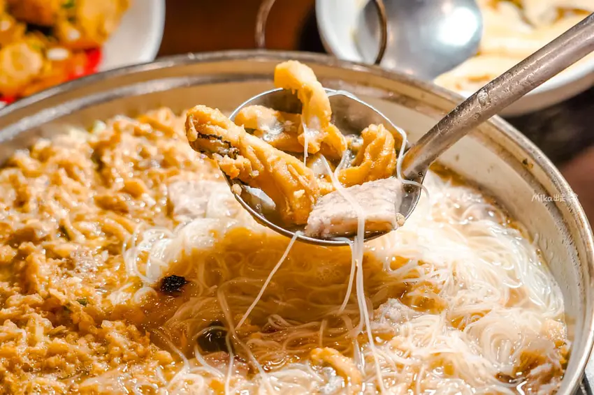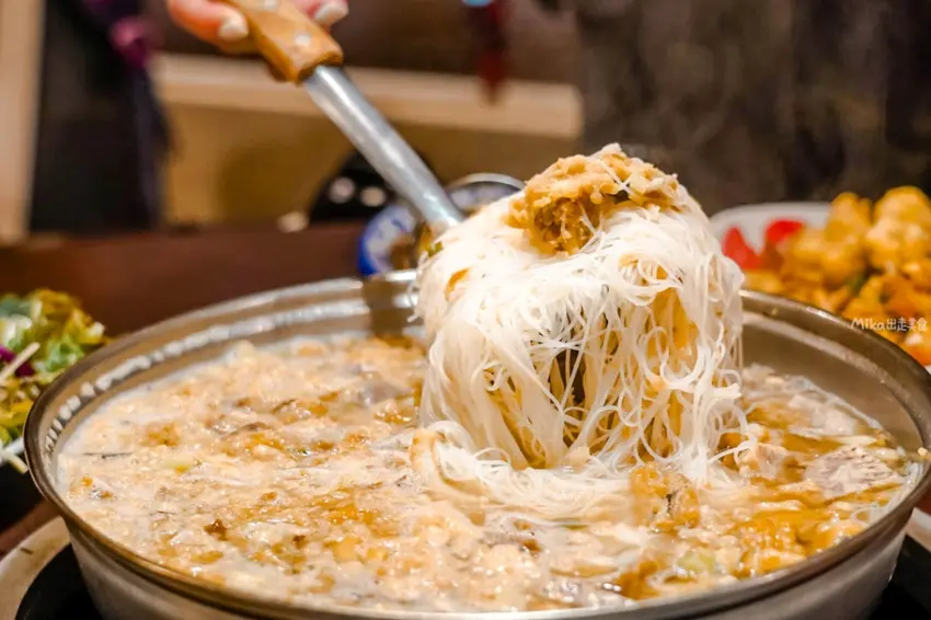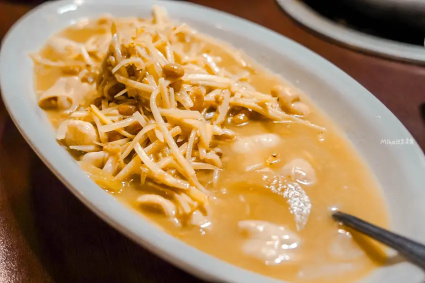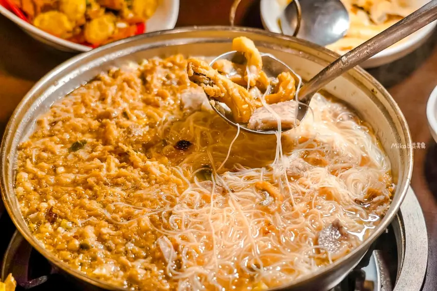 湯品部分首推「白魚米粉鍋」,這道菜一上桌就讓人驚艷。原本以為湯面上漂浮的是蛋酥,仔細一嚐才發現是用白帶魚炸成的「魚酥」,口感鮮香帶脆,吸飽湯汁後風味更佳。鍋內配料豐富,除了滑順的米粉外,還加入了大塊的炸芋頭,綿密鬆軟的口感與鮮美的湯頭完美融合。整鍋湯頭濃郁鮮甜,喝起來暖胃又飽足,是許多老饕來到這裡指名必吃的特色料理。
