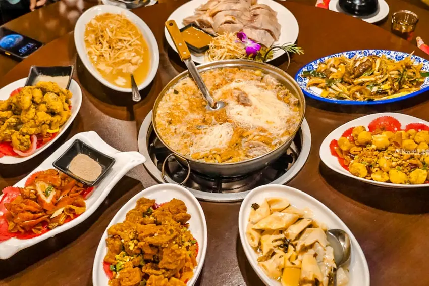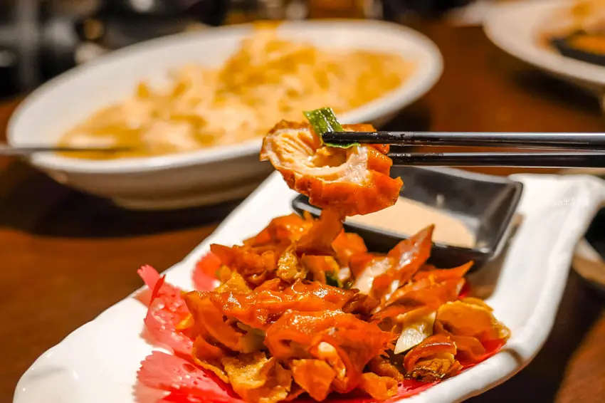 這裡最佛心的服務莫過於內用提供「白飯、雞油拌飯」免費吃到飽。淋上金黃色澤雞油的白飯,香氣撲鼻,口感比傳統豬油拌飯來得更加清爽不油膩,光是這道就能讓人多扒好幾碗飯。菜單選擇豐富,提供單點與合菜兩種模式,單點炒青菜僅需 180 元起,合菜套餐則有 5000 至 8000 元不等的價位。這次我們九個人點了八菜一鍋,結帳金額竟然不到 3000 元,份量大到吃不完還打包,CP 值簡直高到破表。